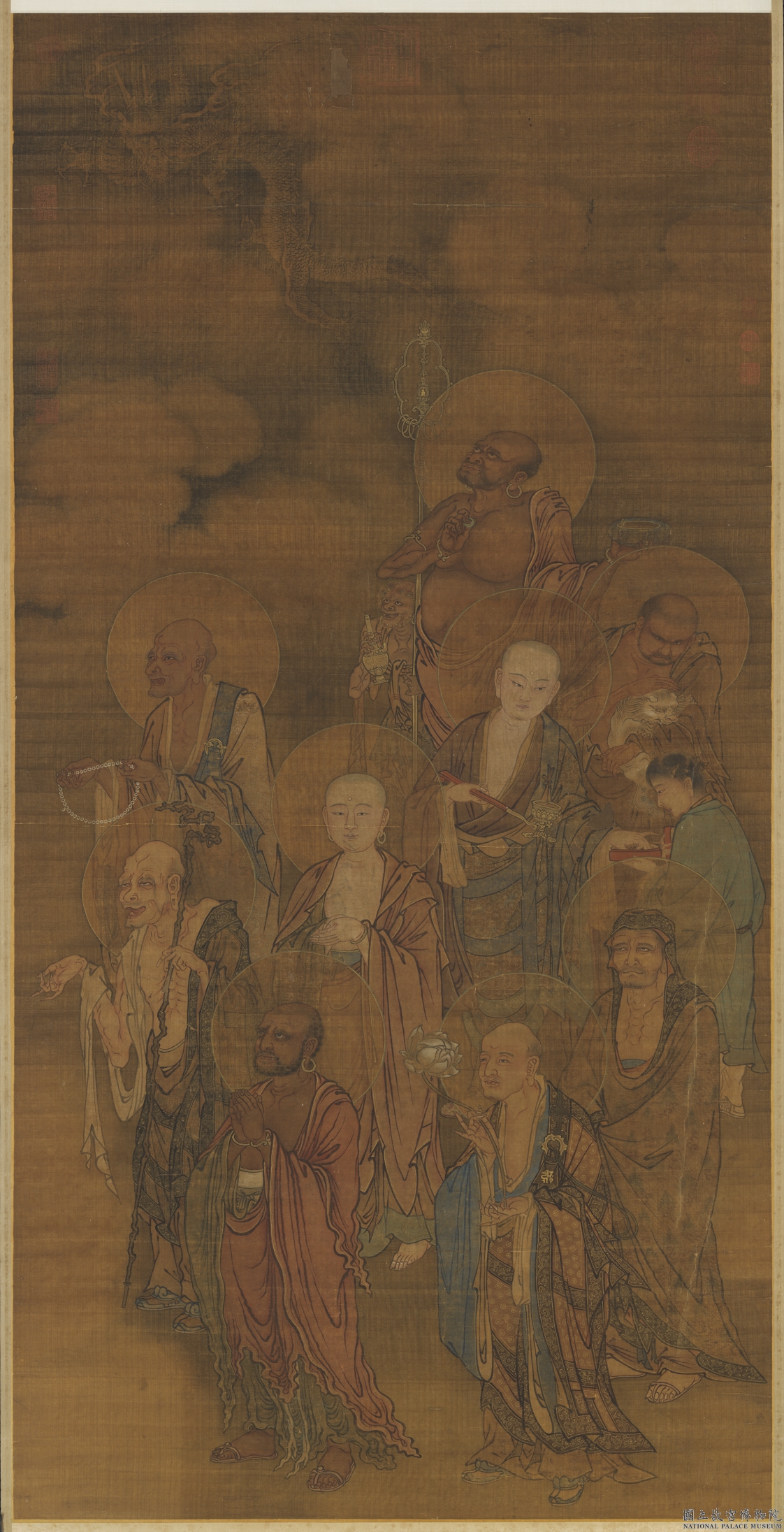 本幅為十八羅漢畫軸二幅之一,畫降龍尊者等九應真與侍者二人,與另幅形成一組十八羅漢對幅。 十八羅漢的名稱不見於經典記載,是在十六羅漢信仰的基礎上發展而來。畫中羅漢手中分持蓮花、念珠、淨瓶、香爐等,形貌各異,或老或少;又或作天竺羅漢,深目大鼻,膚色深褐,或為漢族比丘,修眉細目,膚色白晰。除此之外,畫家更傳神地描寫了這些人物的精神狀態,例如,上方的降龍羅漢,抬頭蹙眉,瞪望空中的騰龍。全作的衣紋線條以凝煉的中鋒完成,時而均勻縈回,流利暢達;又時而頓挫轉折,挺勁有力,不但變化多端,而且準確地掌握人物衣下的身軀結構。人物的五官和髭鬚都以細筆鉤畫,衣上的圖案也描繪得一絲不苟。