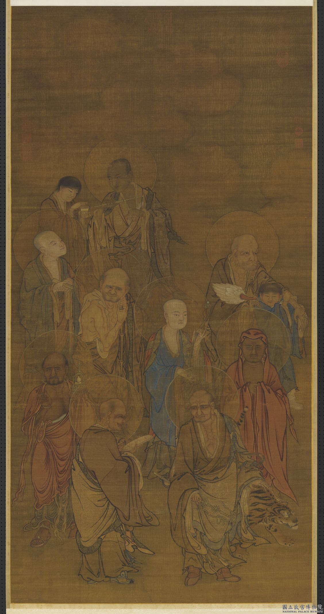 本幅為十八羅漢畫軸二幅之一,畫伏虎尊者等九應真與侍者二人,與另幅形成一組十八羅漢對幅。十八羅漢的名稱不見於經典記載,是在十六羅漢信仰的基礎上發展而來。 畫中羅漢手中分持經卷、錫杖、羽扇、拂塵等,形貌各異,或老或少;又或作天竺羅漢,深目大鼻,膚色深褐,或為漢族比丘,修眉細目,膚色白晰。除此之外,畫家更傳神地描寫了這些人物的精神狀態,例如下方手持貝葉經的羅漢,眉開眼笑,滿臉歡愉。全作的衣紋線條以凝煉的中鋒完成,時而均勻縈回,流利暢達;又時而頓挫轉折,挺勁有力,不但變化多端,而且準確地掌握人物衣下的身軀結構。人物的五官和髭鬚都以細筆鉤畫,衣上的圖案也描繪得一絲不苟。