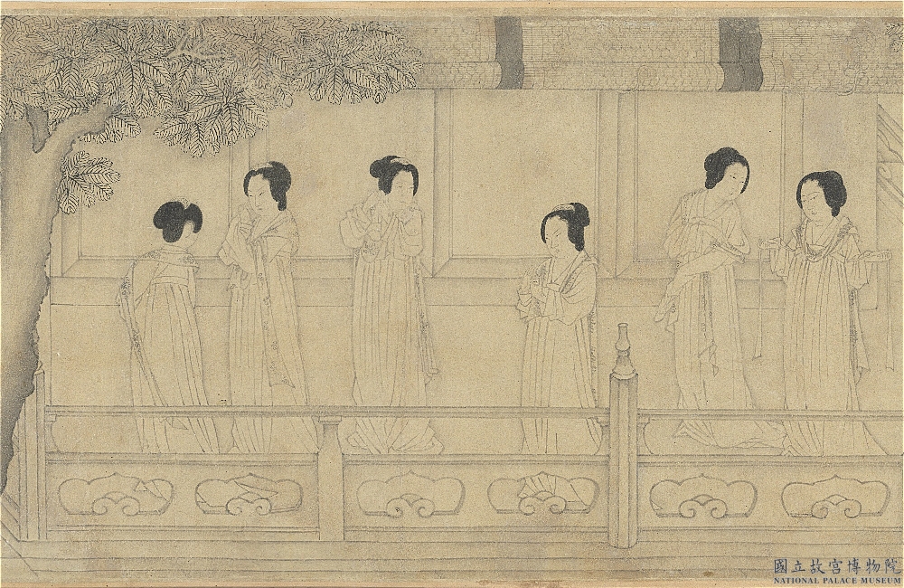 牟益(1178-?),四川人。活動於理宗、度宗兩朝,工畫人物,兼善古文與篆書。 〈擣衣圖〉作於1240年,創作原型取自南朝詩人謝惠連(397-433)〈擣衣詩〉。純以白描輕墨,畫婦女卅二人,在將寒時節,循序進行搗練、剪裁、製衣、裝箱、封寄的過程。畫中諸女皆面容圓潤,衣裙寬大,猶保有唐人餘韻。人物儀態,舉止優雅,惟在眉宇間多有愁思之意,傳透出對良人從軍未歸的掛念情愫。 畫上有南宋董良史題詩,據跋文牟氏於1238年居瀋陽安國僧舍期間作〈擣衣圖〉一卷,兩年後攜至江西,留置文昌吳公處,同年秋天寄寓董良史家,又取舊粉本重畫,並增加十人、四樹,又於砧杵上加屋舍,繪成後贈予董,故知為一稿作兩圖,今所傳者為第二卷,由跋後署款:「嘉熙庚子良月既望,蜀客牟益德新書」得知此畫作成於1240年,卷上有清代鹽商巨富安儀周(1683-1744)、高士奇(1645-1703)之收藏印記。