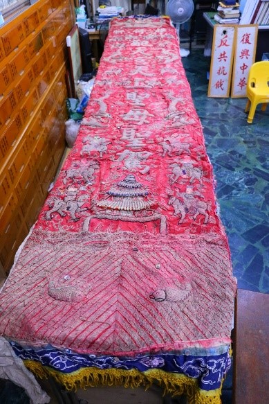 1. 獸肉商捐贈朴子配天宮三十六官將大北旗,積極參與廟會信仰活動,見證大正九年(1920)朴子市井商業經濟活動的熱絡。 2. 刺繡工藝精細,双面刺繡對位精確,人物帶騎造型活潑,臉部表情鮮活,文字圖案構圖清晰,彰顯大正年間刺繡工藝美術的精緻。 3. 獸肉商主祀上帝公,三十六官將為其部眾,將之繡入大旗,代表上帝公的存在及其庇護眾生之意義。