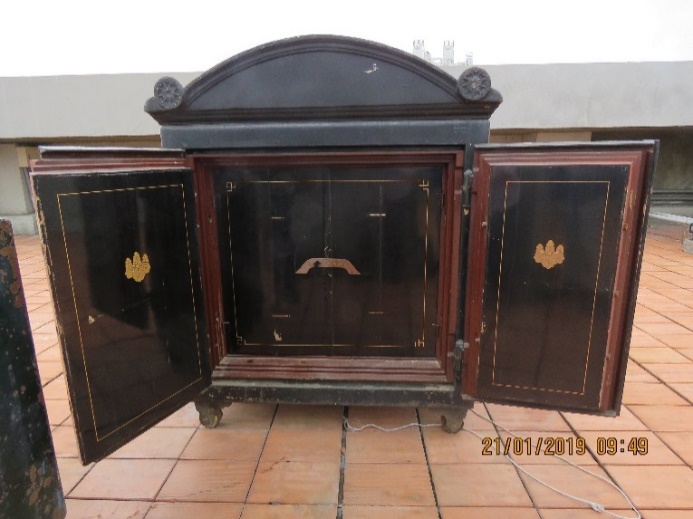 有損傷。 保存現狀描述:目前雙開奉安櫃的保存空間不利古物存放,外立面部分黑漆已經脫落,最內層的梧桐木門左側已經損壞,構件尚保存於奉安庫中,鏨刻銅片部份生有銅銹。