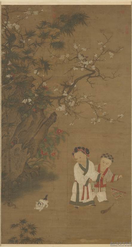 本幅描繪庭園的太湖石旁,梅花、山茶盛開,並有翠竹與蘭草相襯,景致雅麗。一對盛裝的姊弟,分持孔雀尾羽和彩旗,專注地逗弄著小花貓。畫家對每一處細節都掌握地異常精準,反映出北宋宮廷繪畫的卓越成就。繪畫風格與人物造型,與院藏蘇漢臣〈秋庭戲嬰〉相倣,可以推斷原本屬於同一組由蘇氏創作的四季嬰戲圖。蘇漢臣(12世紀),開封人。宣和間任畫院待詔,宋室南渡後,再入紹興畫院。多寫道釋、人物,尤其擅長童嬰題材。