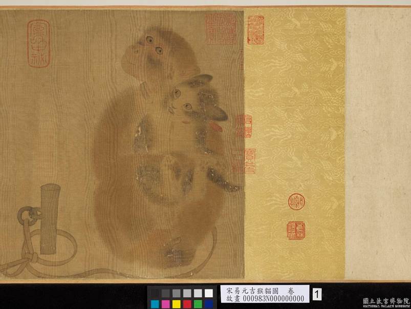 易元吉(11世紀後半),今湖南長沙人。天資穎異,初以畫花鳥專門,後來因為見到趙昌(10-11世紀間)畫作,深感歎服,立志要超邁古人所未到處,遂改畫獐猿而馳名。 本幅左上方,有徽宗御書畫題。右側繪一猴被木樁所縛住,兩隻幼貓路過,一隻遭黃猴挾持,攬入懷中,另一隻趕忙走避,並回頭張口嘶叫。猴兒卻不為所動,依然逗弄著小貓,神色自若。畫家透過敏銳的觀察,將猴與貓之間的互動,傳神表達,充分突顯北宋繪畫超卓的寫生精神。
