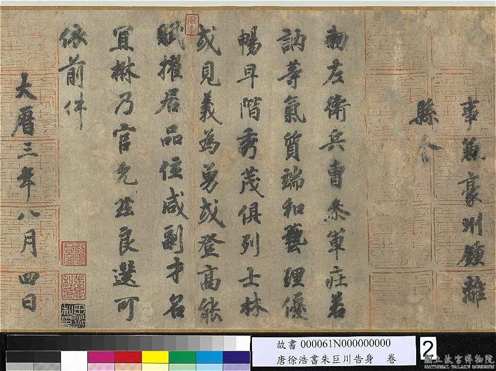 徐氏於肅宗(756-762)時期受重用,多寫詔令,堪稱中唐官方書法品味代表,影響力甚大。 本卷是傳世極稀之藝術品與歷史文物,體現唐代告身制度具體實踐方式和結果,同時反映中唐時期官方文件認可與應用的書法風格。在傳世唐代告身實物數量稀少又多殘缺不全情況下,對於研究唐代法制史與書法史具有不可取代意義。