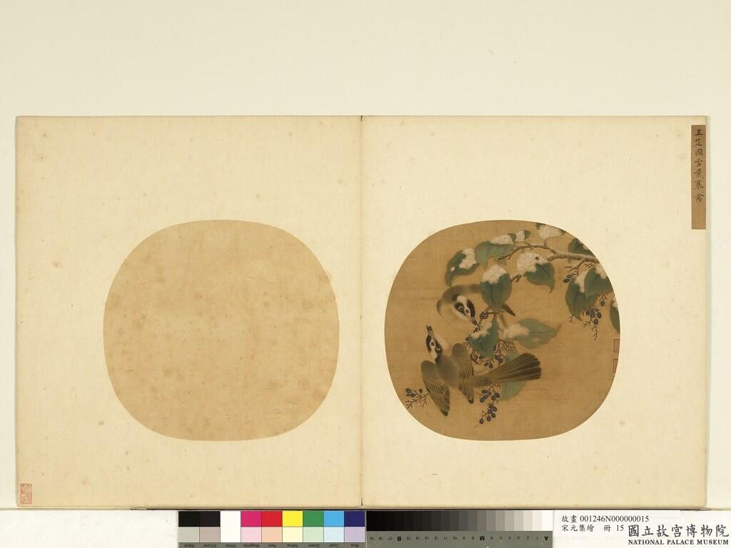 宋代的王定國(11世紀)有二人,一為北宋詩人,生卒年里待考,約與蘇軾(1037-1101)同時。另一說為汴人,建炎元年(1127)南渡,居臨安。 本幅收在《宋元集繪》冊第十五開,畫上並無作者款印,裱紙右方的籤題訂為王定國。畫面右方的收傳印記為明王世貞的貞、元半印。畫為紈扇式格局,描繪寒冬中兩隻白頭翁一俯一仰,啄食著靛藍色的女貞樹果。整體布局呈現S形曲線,律動感十足。葉片及樹枝上飄落的白雪,均以細點密集堆壘,畫鳥羽亦精謹工緻,凸顯出宋人寫實的審美風尚。
