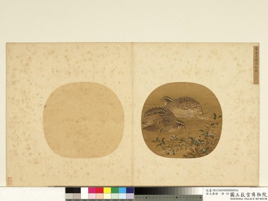 本幅選自《宋元集繪》冊第十六幅,為紈扇改裝成冊頁形式,畫幅無款,裱紙右上籤題書「李安忠」。李安忠(活動於1119-1162),錢塘人。北宋徽宗宣和(1119-1125)年間任畫院祇候,南宋高宗紹興年間(1131-1162)復職並以畫藝高超,被授予金帶。 畫中沙地上兩隻鵪鶉,一蹲踞啄食,一擺動足爪進行沙浴,前景土坡,並綴以開花結實的枸杞。「杞」與「祈」,「鵪」與「安」發音相近,本幅亦帶象徵祈願平安吉祥寓意。 畫法用雙鉤填彩,描繪細膩妍雅,雖簡樸田野一角,感覺卻異常華麗。充分展現宋代畫家縝密觀物時代風尚,可據以印證宋代翎毛繪畫卓越藝術成就。