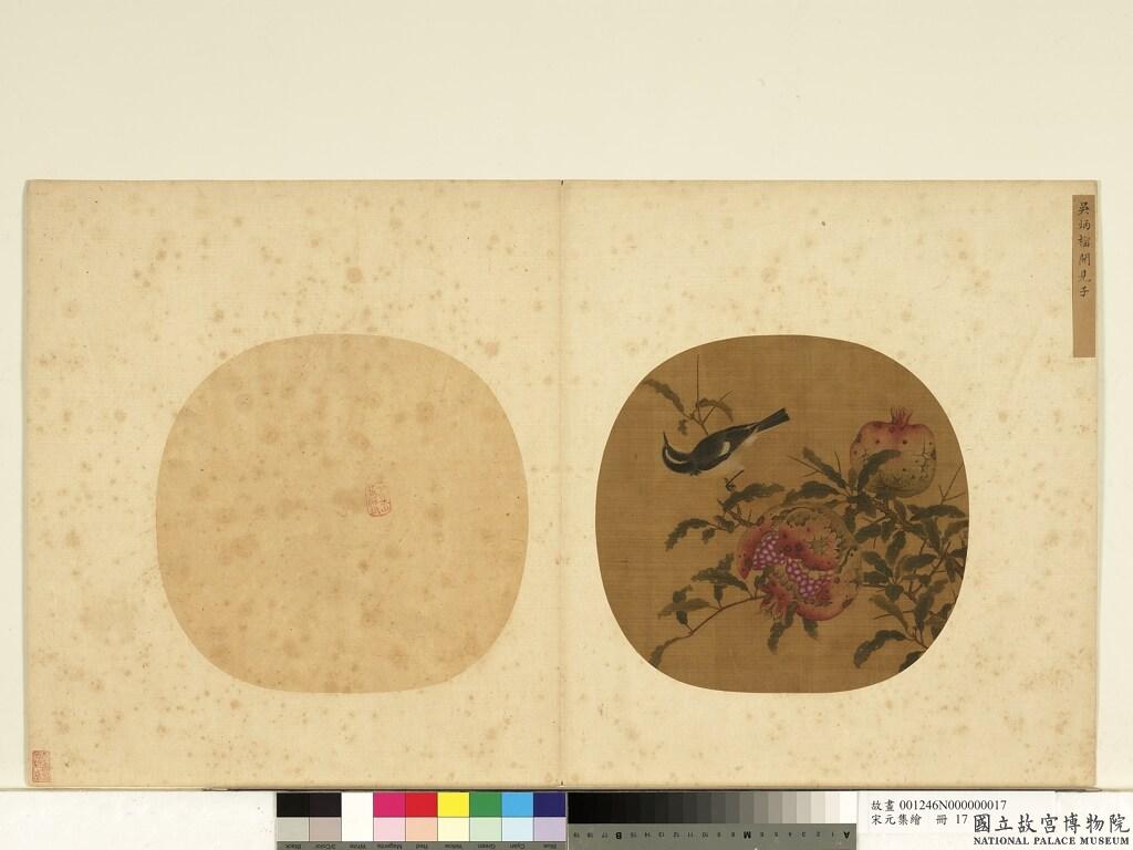 本幅收於《宋元集繪》冊第十七開,右方葉隙間藏吳炳款。吳炳(12世紀),毘陵人。南宋光宗紹熙(1190-1194)初任畫院待詔,善作折枝花鳥,彩繪精緻而富麗。 在紈扇形格局中,畫石榴枝上結兩枚業已熟透果實,枝梢停駐一白眉鶲探身迴首,姿態極輕盈婉約。 中國常藉石榴象徵圓滿、豐盛與多子多孫,所以此作於展現自然生態外,也蘊含祝願吉祥寓意。是宋代小品翎毛繪畫中精彩傑作。