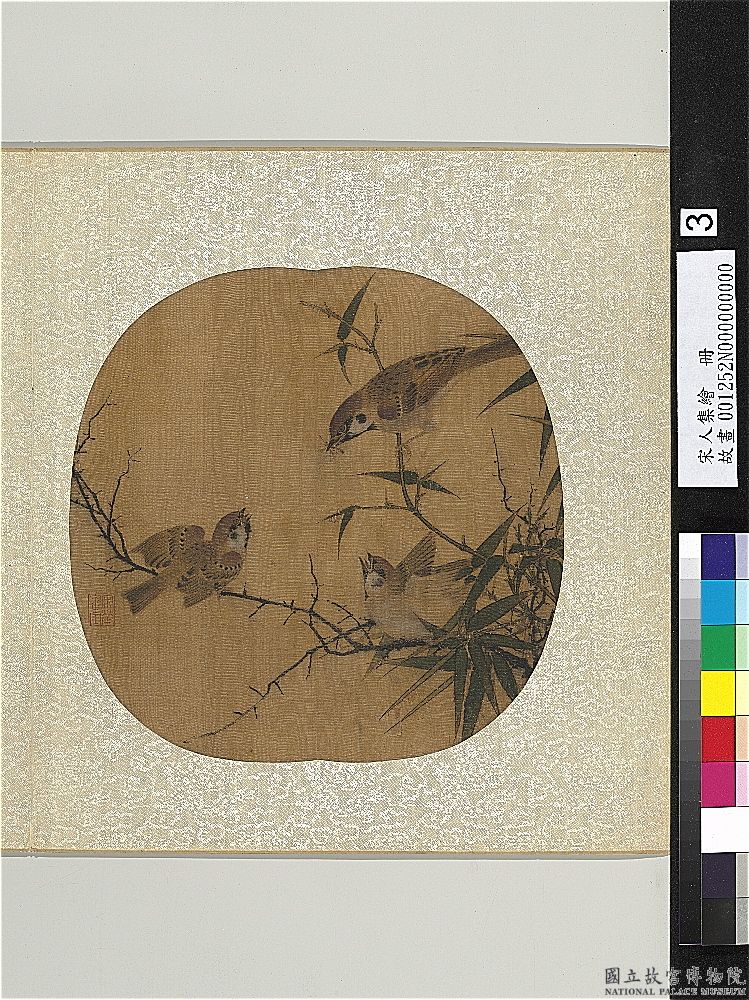 〈竹樹馴雀〉收於《宋人集繪》冊第三開,無作者名款。著錄見《石渠寶笈三編》,原為紈扇,後改冊頁形式。 本幅畫三隻麻雀,一母二子,母鳥正銜蟲餵食小鳥;竹樹和荊枝線描極見挺勁,因被鳥踏駐,顯搖曳不定。整體傳達出麻雀親密互動及細膩竹枝彈性。 畫中充分展現出宋代花鳥畫家對翎毛縝密觀察,不僅形象逼真,尤其充滿鮮活情態,為宋代翎毛小品中精彩傑作。