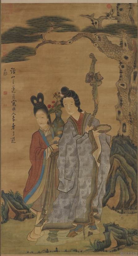 傳說西王母壽誕舉辦蟠桃盛會,諸仙齊來祝壽。麻姑以靈芝釀酒祝壽,花仙受邀同往,手捧碩大梅瓶插紅艷柿果,備鮮花美酒前來祝壽。畫中人物面相端莊美麗,衣紋圖案描繪工細,新穎別緻,通過線條提頓轉折表現誇張造型。陳洪綬(1599-1652)擅長處理織品質材、紋樣,青銅花器銅鏽色彩細緻描寫,呈現晚明文人崇尚「復古」心理。古松、奇石均為長壽的象徵,寓有平安長壽之意。松樹刻畫精細入微,針葉彷如華蓋罩頂,具有獨特的視覺效果。