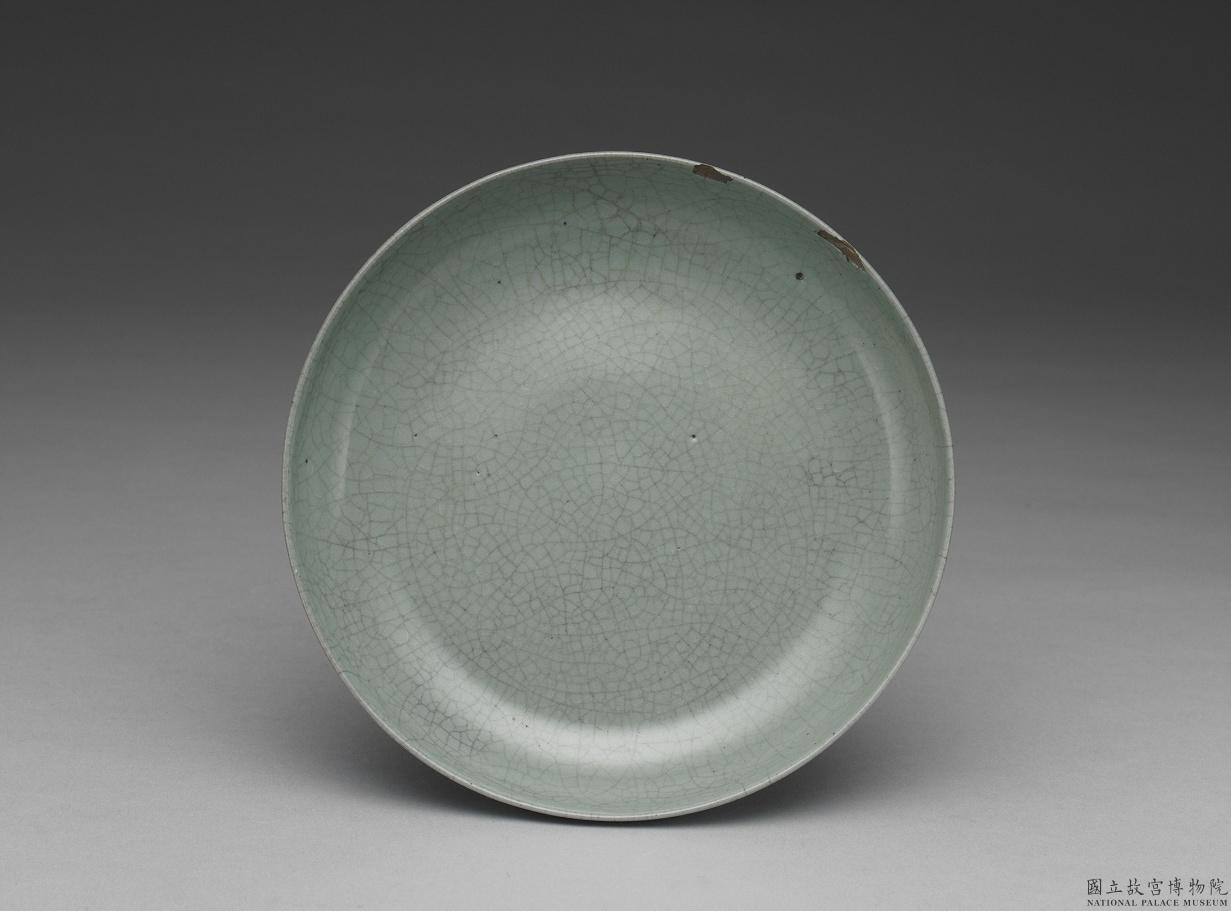 斂圓口,淺弧形壁,平底,圈足微外捲。胎體稍薄,滿施天青色釉,釉薄處隱現淺粉色光澤。內周壁積釉處,有冰裂紋。底周有五枚支燒痕,中心鐫刻一「甲」字銘,周繞乾隆皇帝〈詠小官窯盤子〉詩,詩末署「乾隆壬辰新春御題」紀年銘(乾隆三十七年:1772),並落「太璞」、「古香」兩枚鈐印。