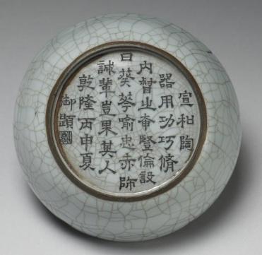 此器通體施青瓷釉,底面鐫刻乾隆皇帝〈詠官窯葵花小盂〉詩,詩末署「乾隆丙申夏御題」紀年銘(1776),並落「比德」一枚鈐印。 御製詩透露出乾隆皇帝將這件作品看成是北宋修内司監造生產的官窯瓷器,而六花口造型特徵,讓他產生葵花向陽生長聯想,進而將之看成具有忠誠隱喻,透過此器的詩文可推知乾隆皇帝陶瓷鑑賞觀,因而顯得珍貴。