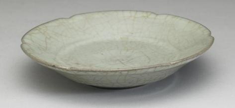 六瓣葵花形,侈口,淺壁,近足際向內轉折成折腰盤式。平底,矮圈足。通體施青瓷釉,釉色灰青,略帶米黃色調,釉表開深色細紋片。口沿釉薄處,現出灰色邊;內裡隱見一些冰裂開片。施釉至足際,足緣無釉,露出燒後胎色。底面鐫刻乾隆皇帝〈詠官窯碟子〉詩,詩末署「乾隆丙申夏御題」紀年銘(乾隆四十一年:1776),並落「古香」和「太璞」兩枚鈐印。