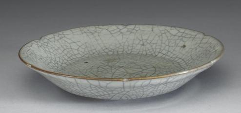 六瓣葵花口,斜壁稍深,至足際向內橫折成折腰盤式,平底,矮圈足。胎體厚重,施青瓷釉,釉色灰青,釉表開深色細紋片。口沿釉薄處,現出一圈灰褐色邊,施釉至足際,足緣無釉,露胎處加塗赭色護胎汁。底面鐫刻乾隆皇帝〈詠哥窯盤子〉詩,詩末署「乾隆乙未春御題」紀年銘(乾隆四十年:1775),並落「朗潤」一枚鈐印。