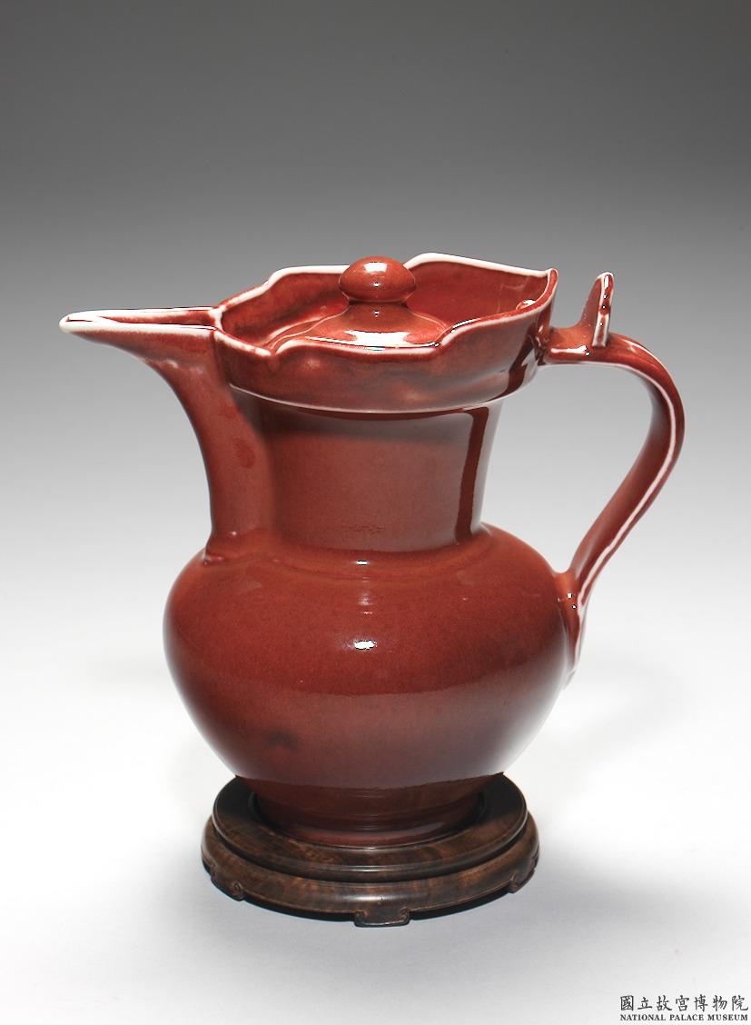 器外通體施紅釉,釉色鮮紅並帶類似橘皮上的針孔氣泡眼,口、足、帽沿邊等出筋處,呈現白邊,內部及底白釉泛青。胎骨勻細,圈足露胎,細膩潔白,間帶鐵質斑點。器外底鐫刻乾隆皇帝〈題霽紅僧帽壺〉御製詩,詩末署「乾隆乙未仲春月御題」紀年銘(乾隆四十年,1775),並落「古香」和「太璞」兩枚鈐印。傳世隨附木座,底面刻上與器底相同詩文,並落「比德」和「朗潤」兩枚鈐印,木座外圍上下左右另刻:「雍邸清玩」四字銘,說明本件作品為雍正皇帝於雍王府時期收藏,亦能與〈深柳讀書堂美人圖〉之「鑑古」一軸對照,印證此段流傳經過。同時這件作品原始典藏標記為「呂」字號,代表清室善後委員會清點清宮文物時,它是養心殿中的陳設。循此線索,對照嘉慶七年《養心殿東暖閣博古格陳設》紀錄,因存在一則:「霽紅僧口壺一件(紫檀木座上刻雍邸清玩,上刻詩,座上刻詩)」的記載,再加上北京故宮所藏另一件明宣德紅釉僧帽壺,底部無刻詩,故以為《陳設檔》所記,正指此品。