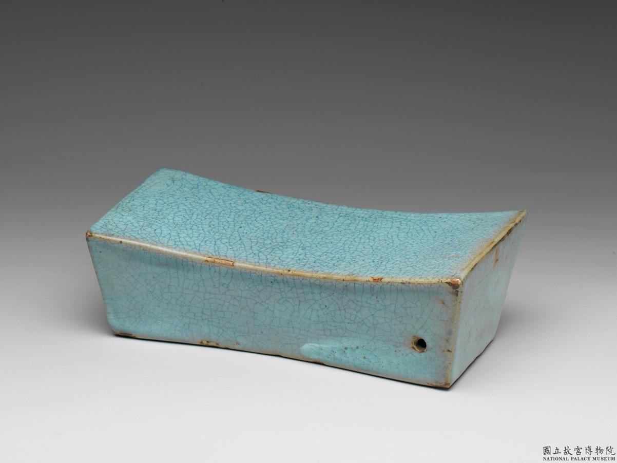 此器長方形枕,面心作凹弧形,周壁前高後低,兩端翹起,後壁右下角開一小孔,器內中空。通體滿施天藍色乳濁濃釉,枕底鐫刻乾隆皇帝〈詠柴窯枕〉御製詩,詩末署「乾隆甲申春御題」紀年銘(1764),並落「乾」和「隆」兩枚鈐印。透過此器的詩文可推知乾隆皇帝陶瓷鑑賞觀,益顯珍貴。