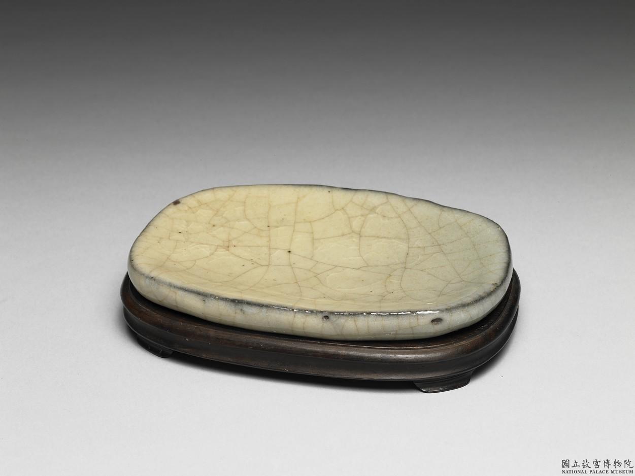 橢圓形,中心略凹,平底無足。通體施青瓷釉,釉色米黃,周緣釉薄處現出灰色邊,底有七枚圓點狀支燒痕,且鐫刻乾隆皇帝〈詠古橢片瓷〉詩,詩末署「乾隆癸丑仲春御題」紀年銘(乾隆五十八年:1793),並落「比德」和「朗潤」兩枚鈐印。