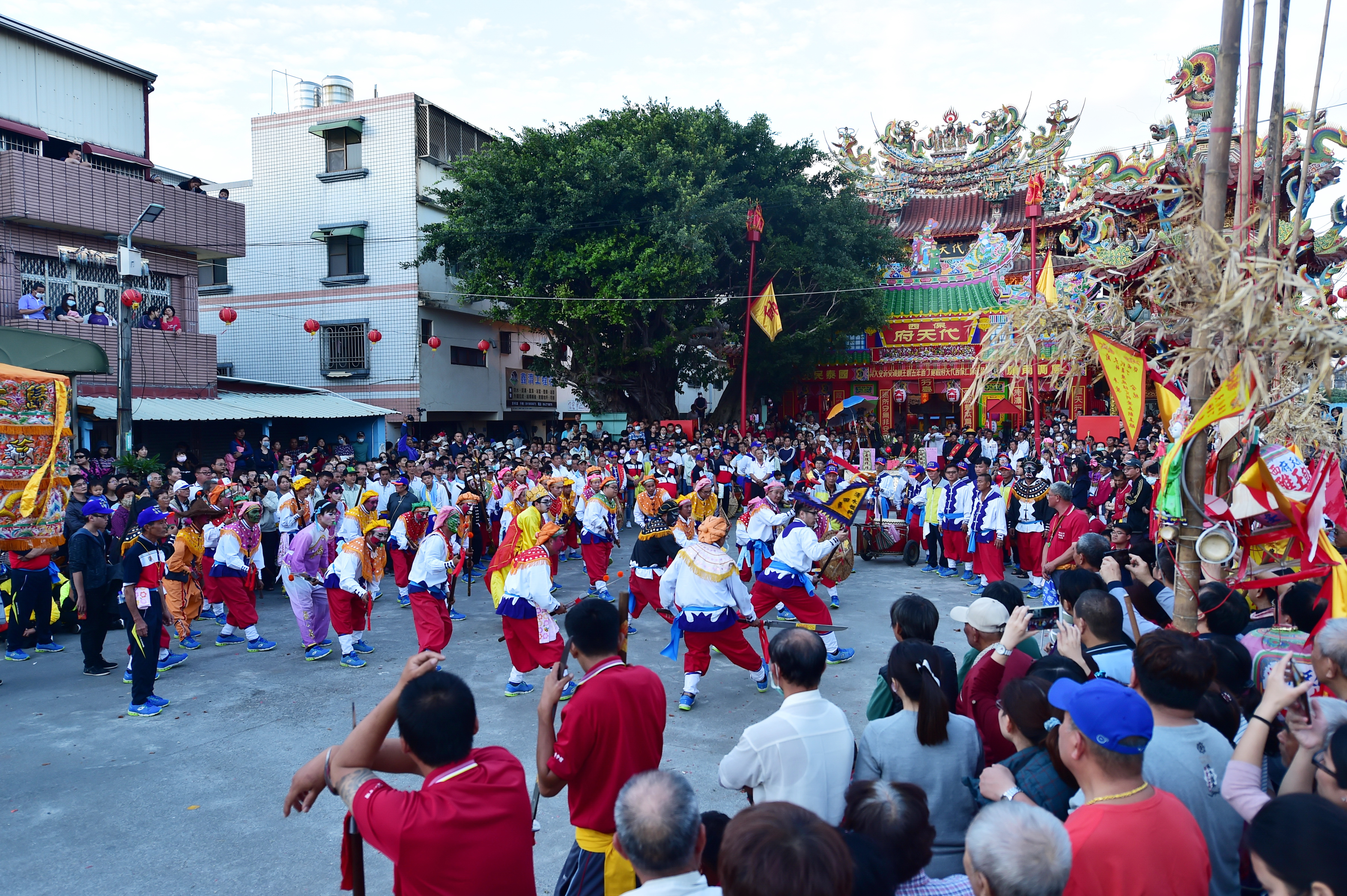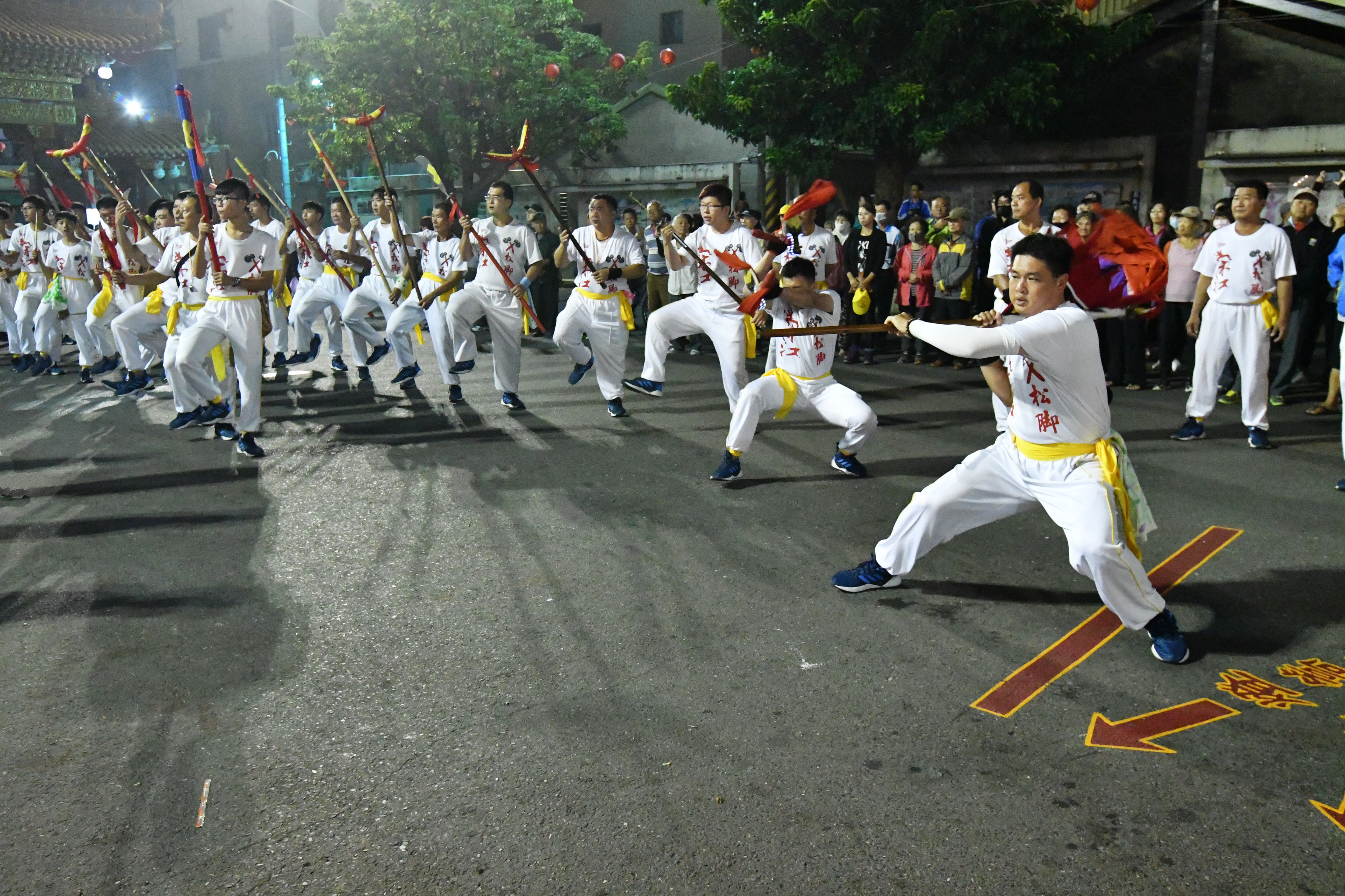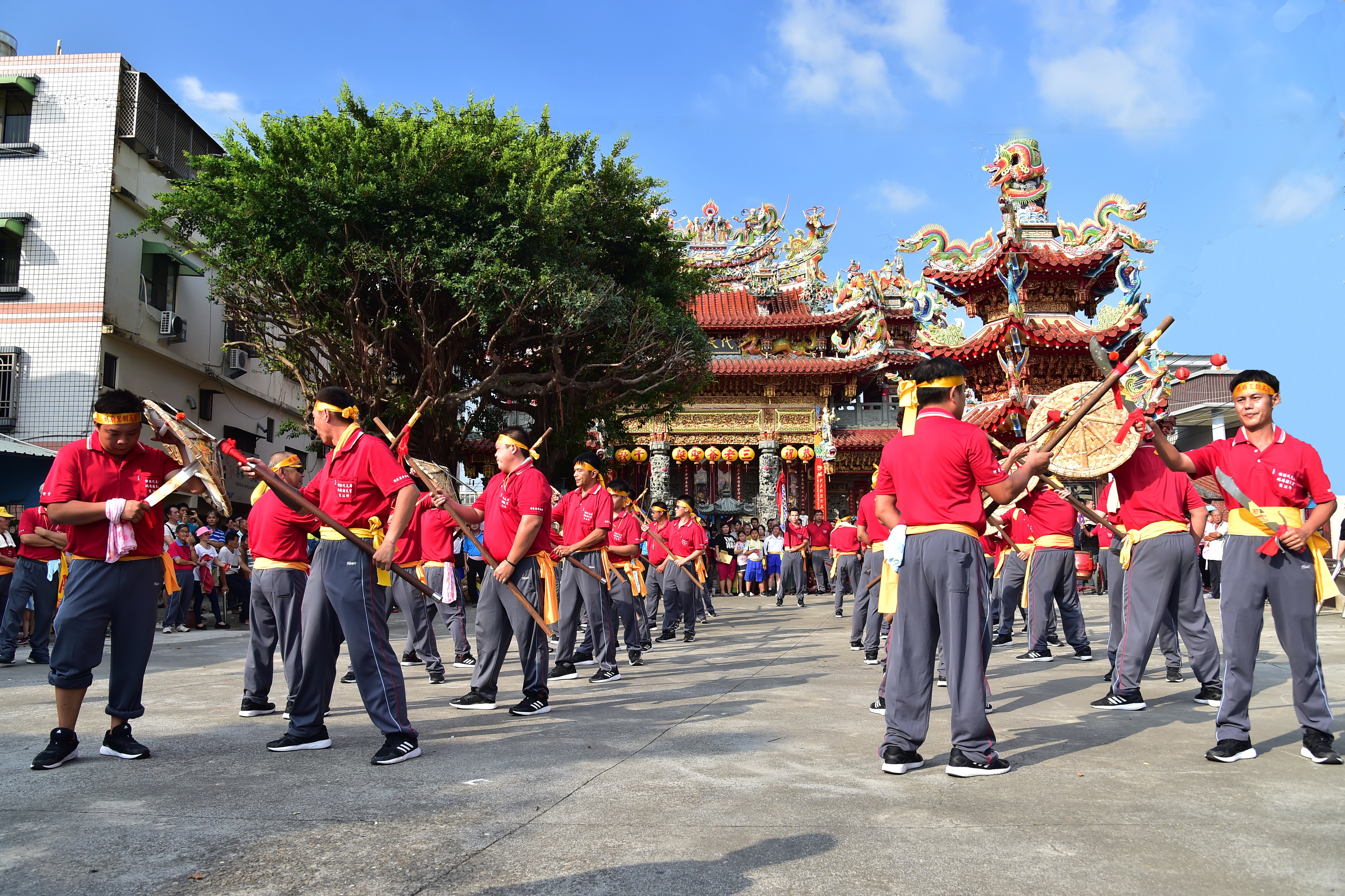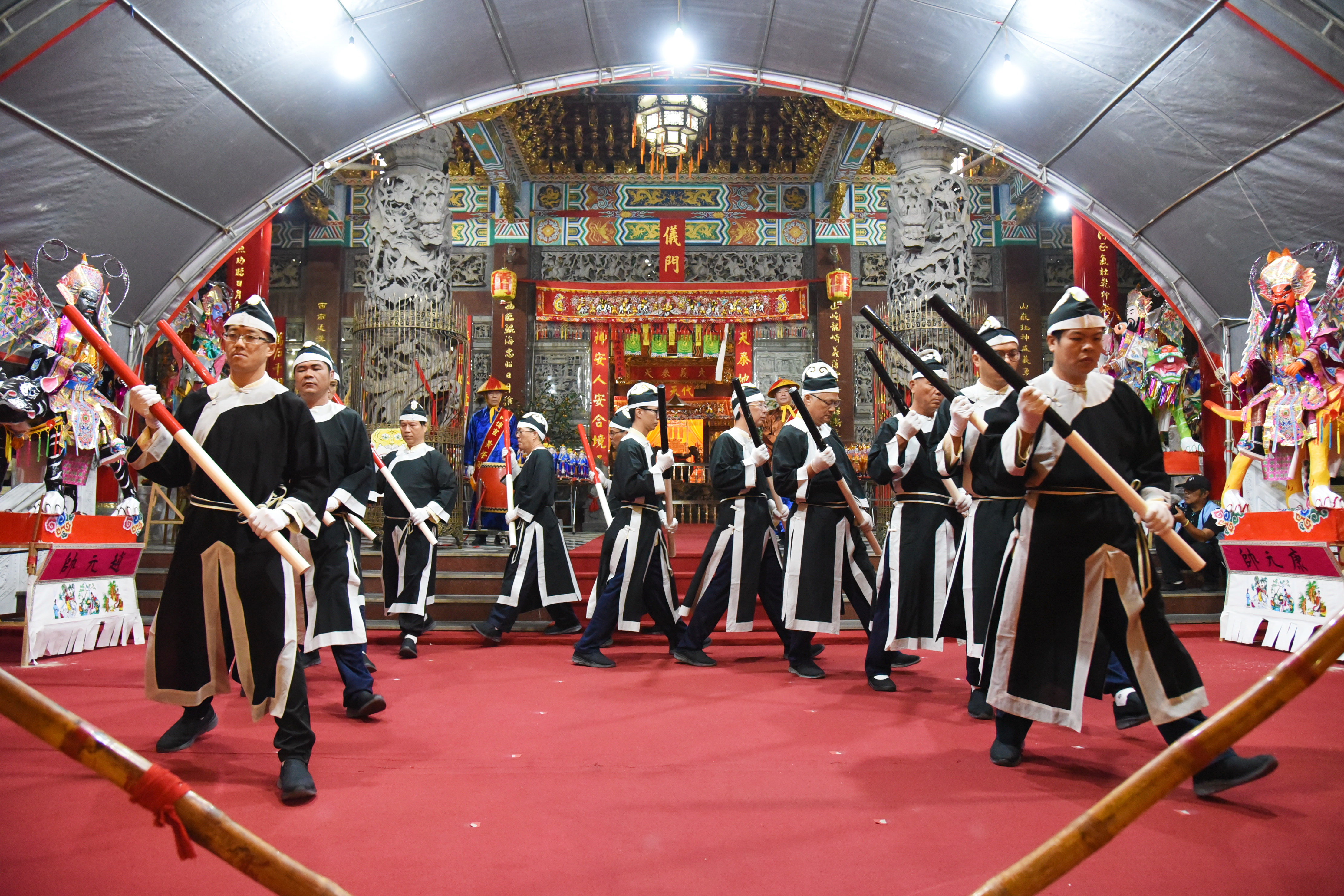 「架棚」係主辦廟境主神校閱所屬陣頭數月來的籌組情形與訓練成果之謂,通常於醮典前舉行,當天所屬角頭各自在廟前廣場自行找地方做整套的表演,如仁壽宮、大人廟均為如此,惟山西宮架棚係於王醮期間舉辦,採遊境的形式,由境內 10 里的陣頭前往新光里遊社。