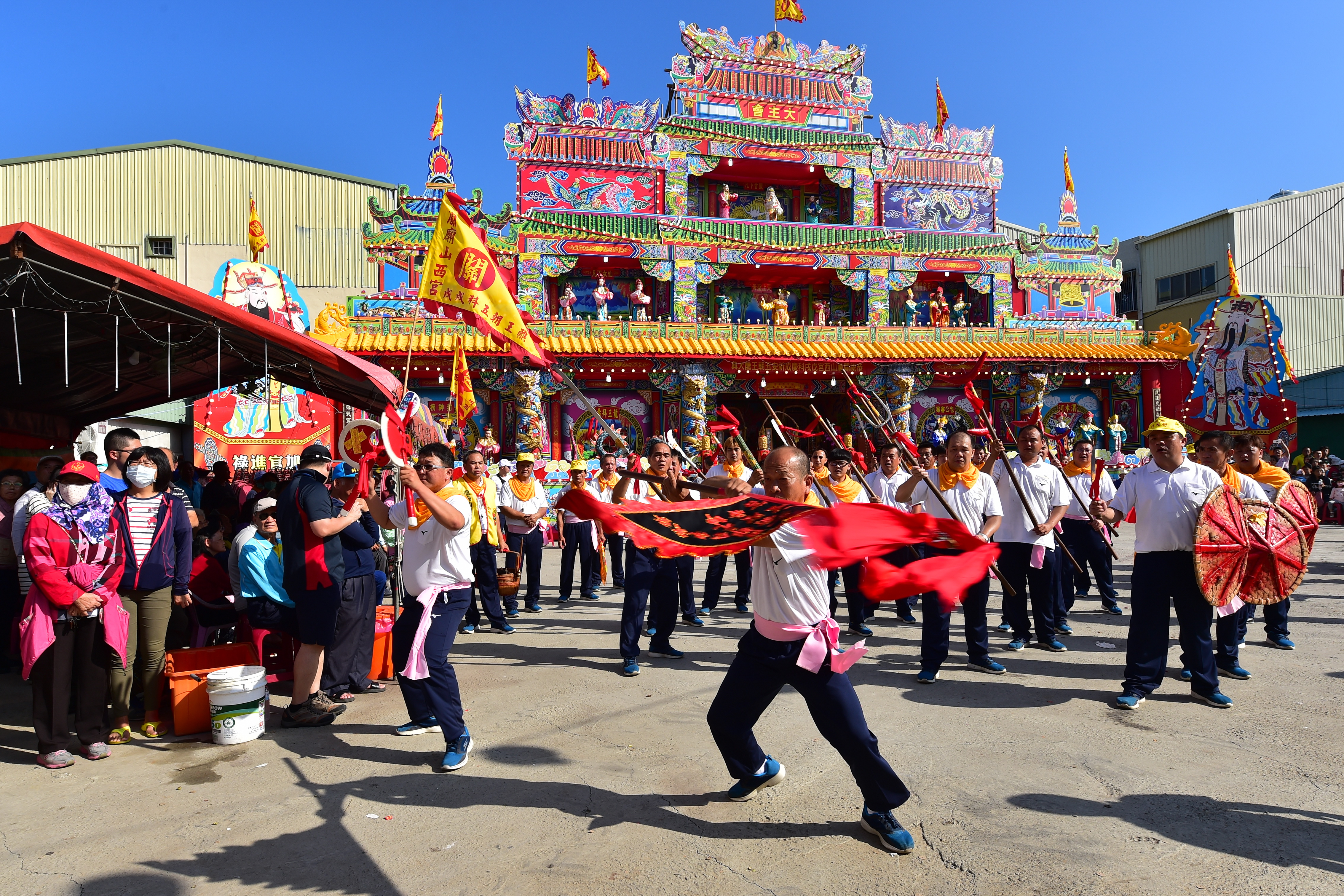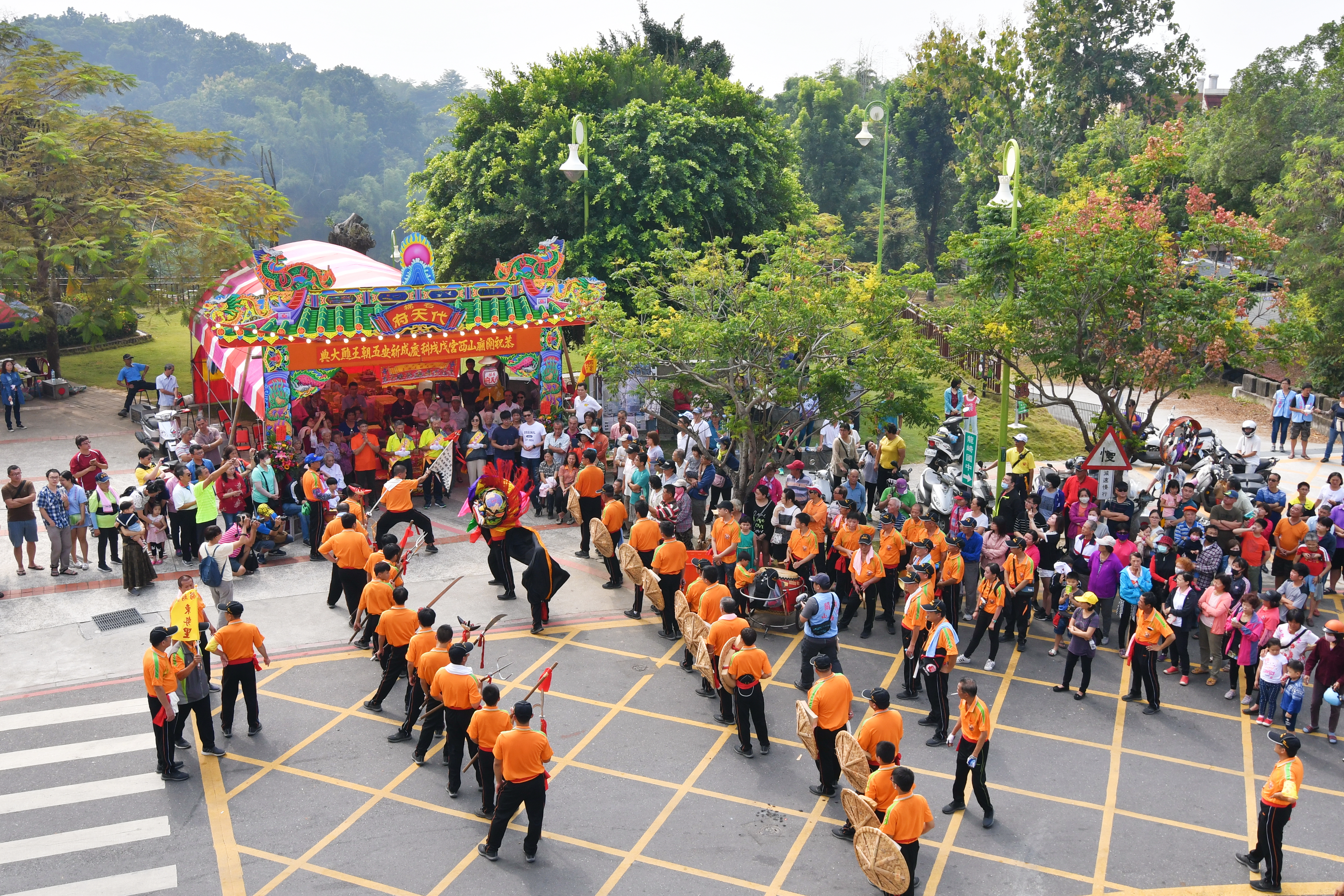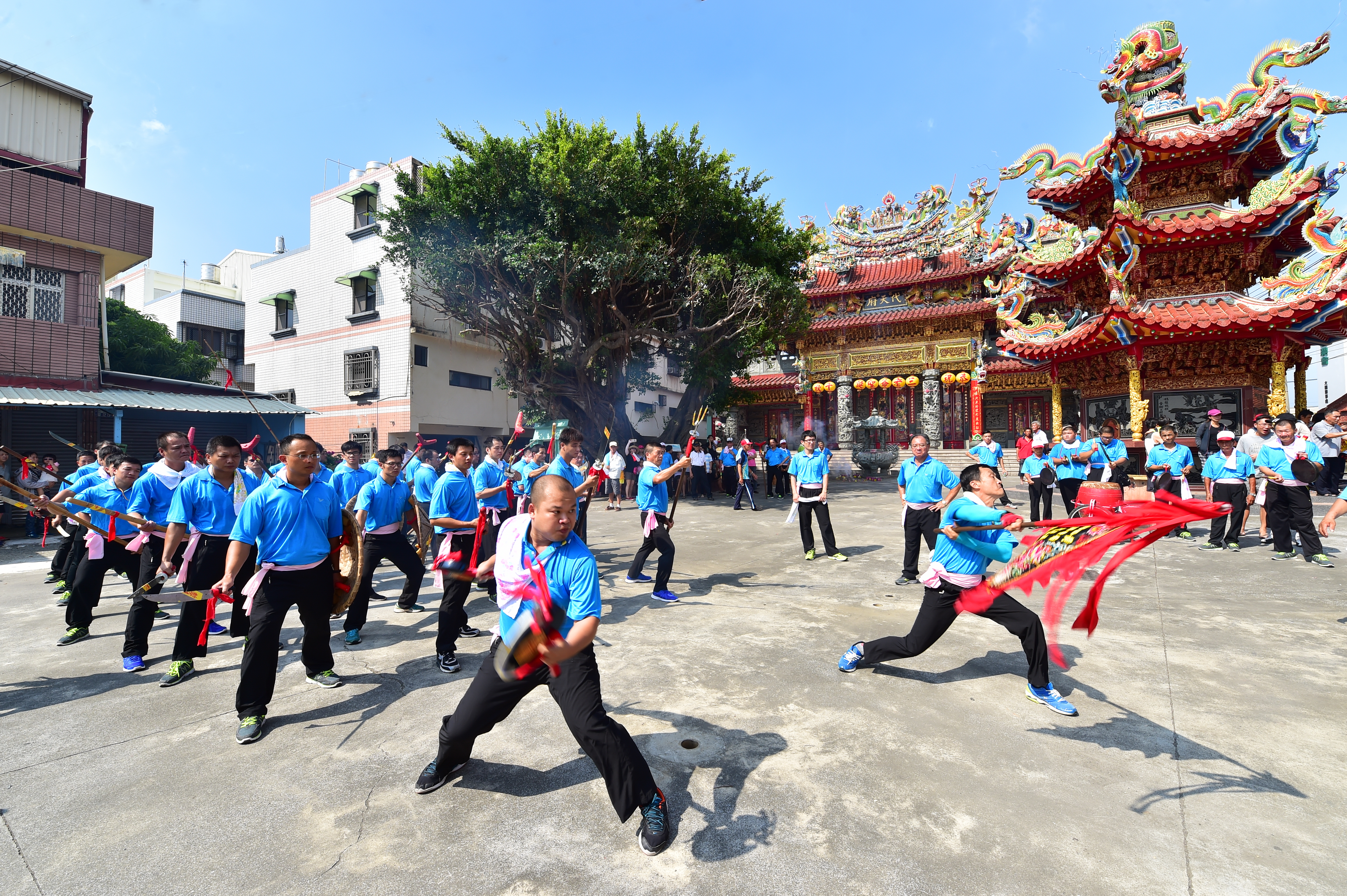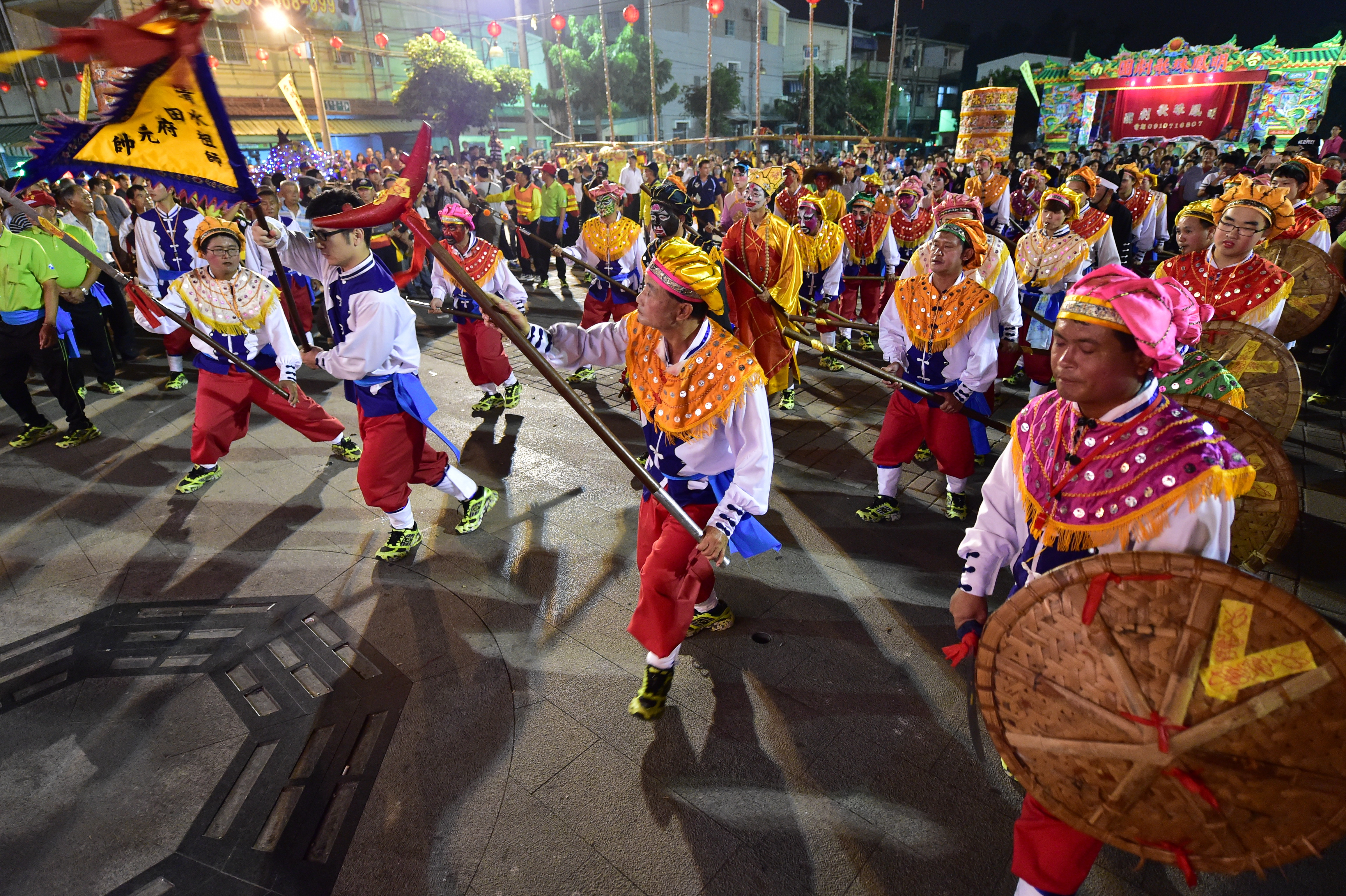 「架棚」係主辦廟境主神校閱所屬陣頭數月來的籌組情形與訓練成果之謂,通常於醮典前舉行,當天所屬角頭各自在廟前廣場自行找地方做整套的表演,如仁壽宮、大人廟均為如此,惟山西宮架棚係於王醮期間舉辦,採遊境的形式,由境內 10 里的陣頭前往新光里遊社。