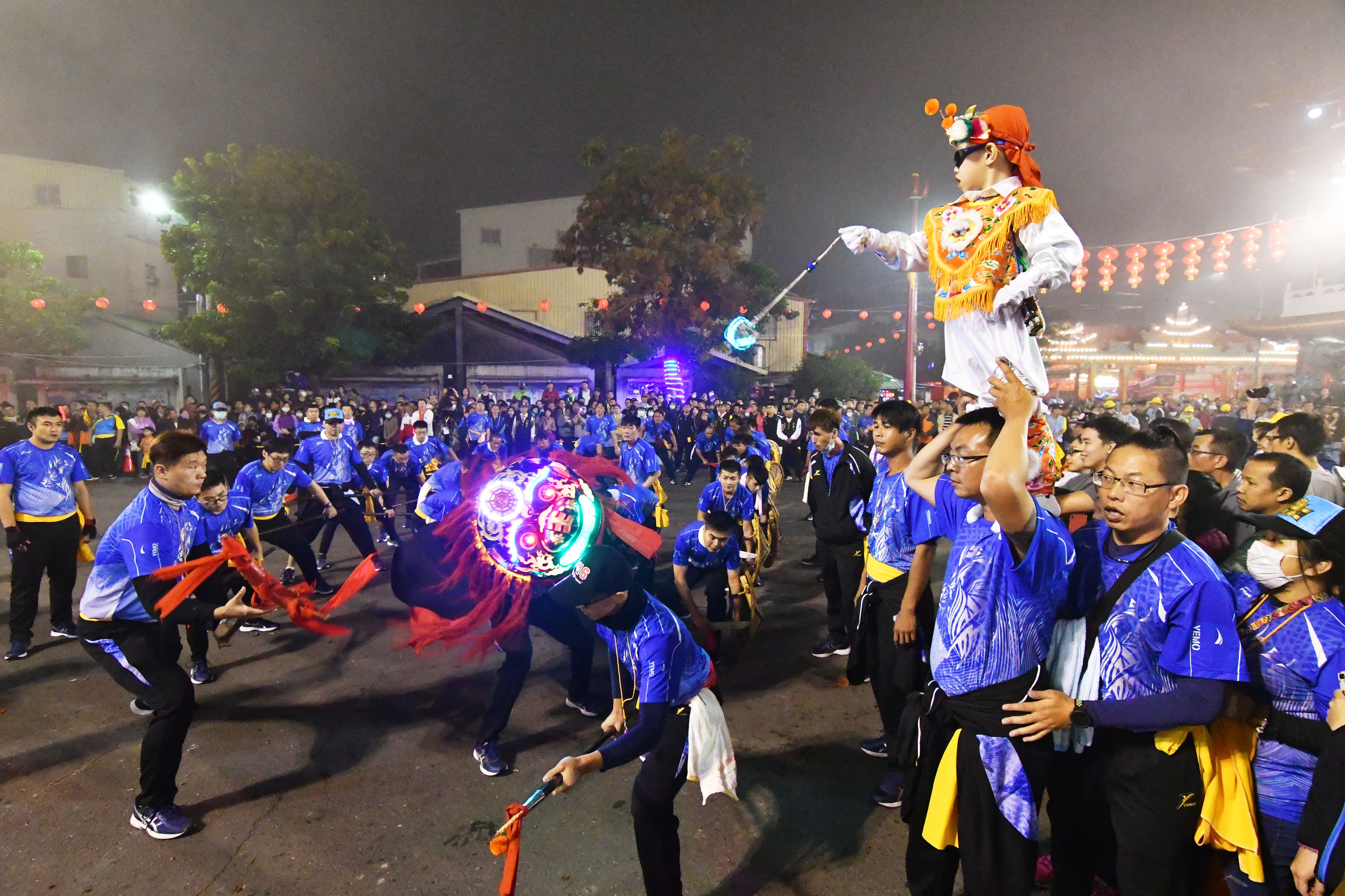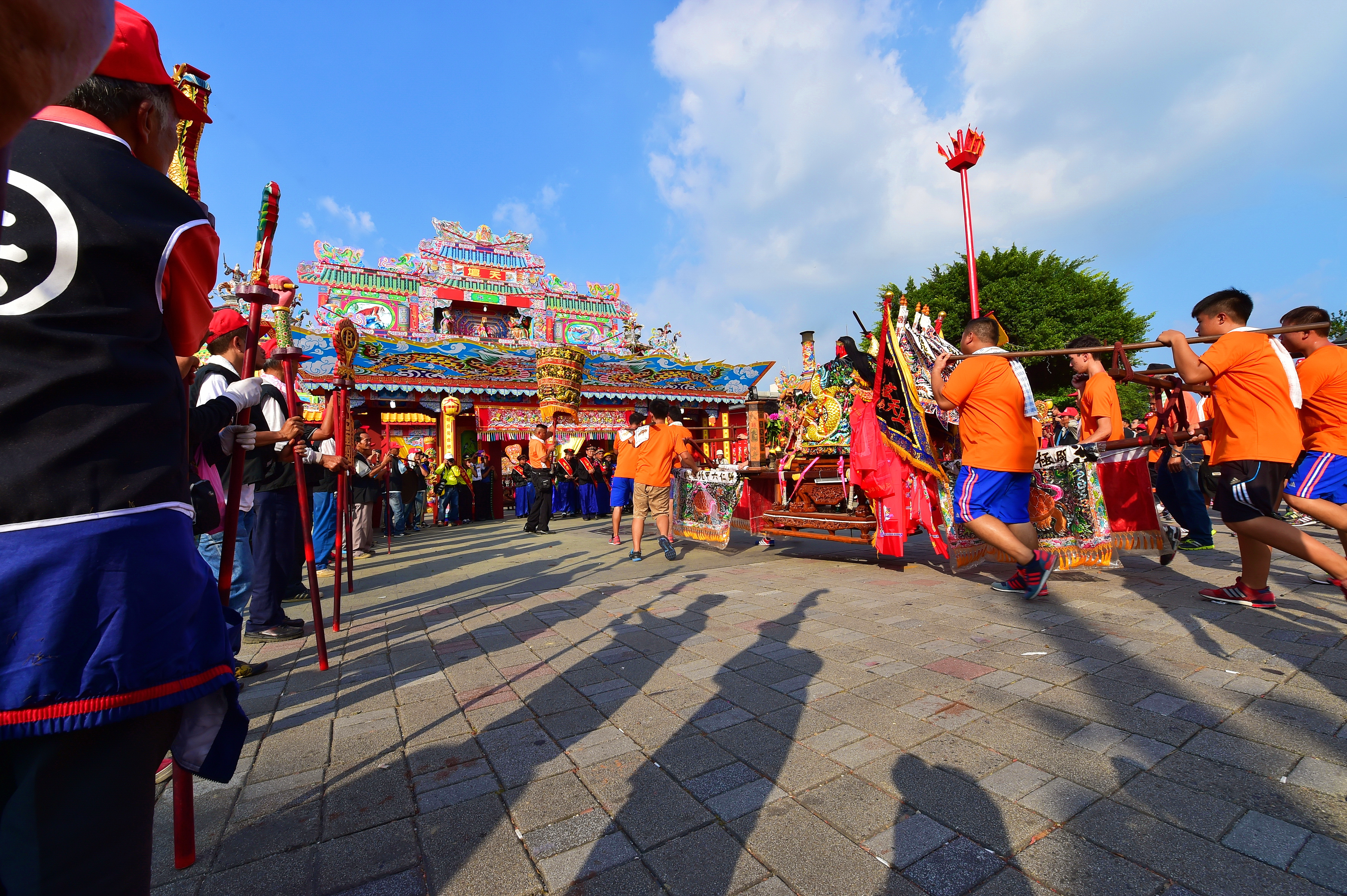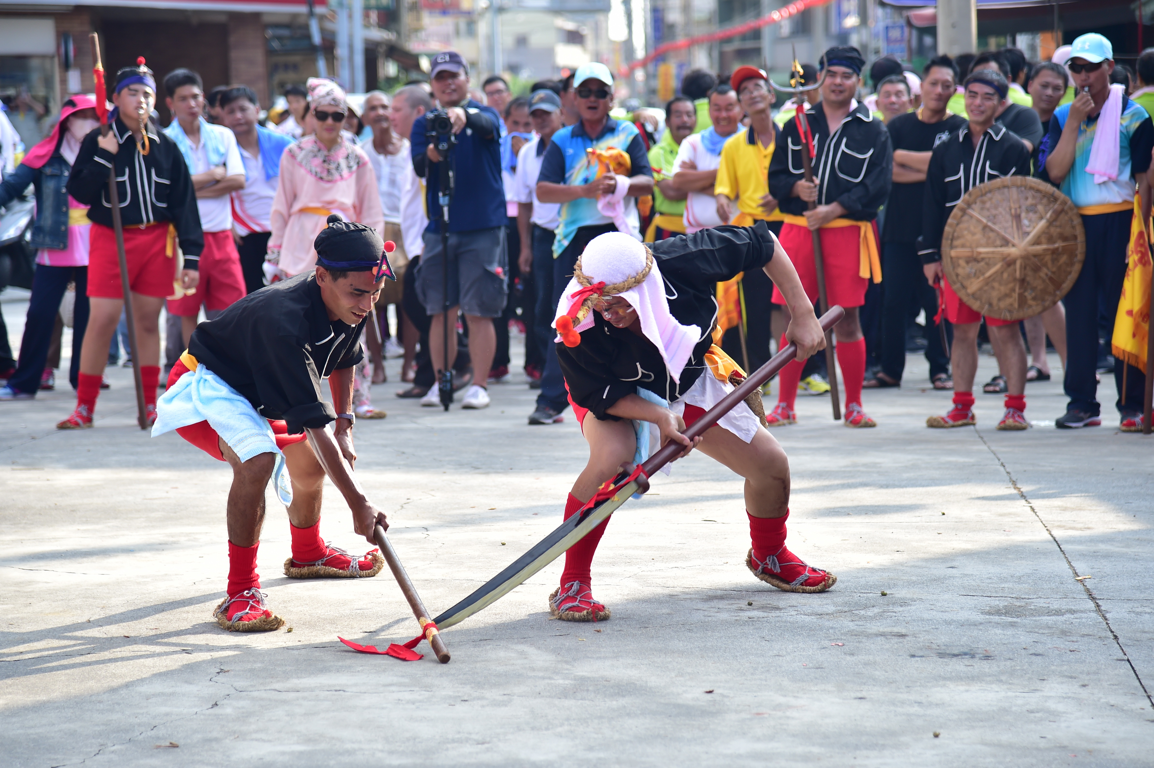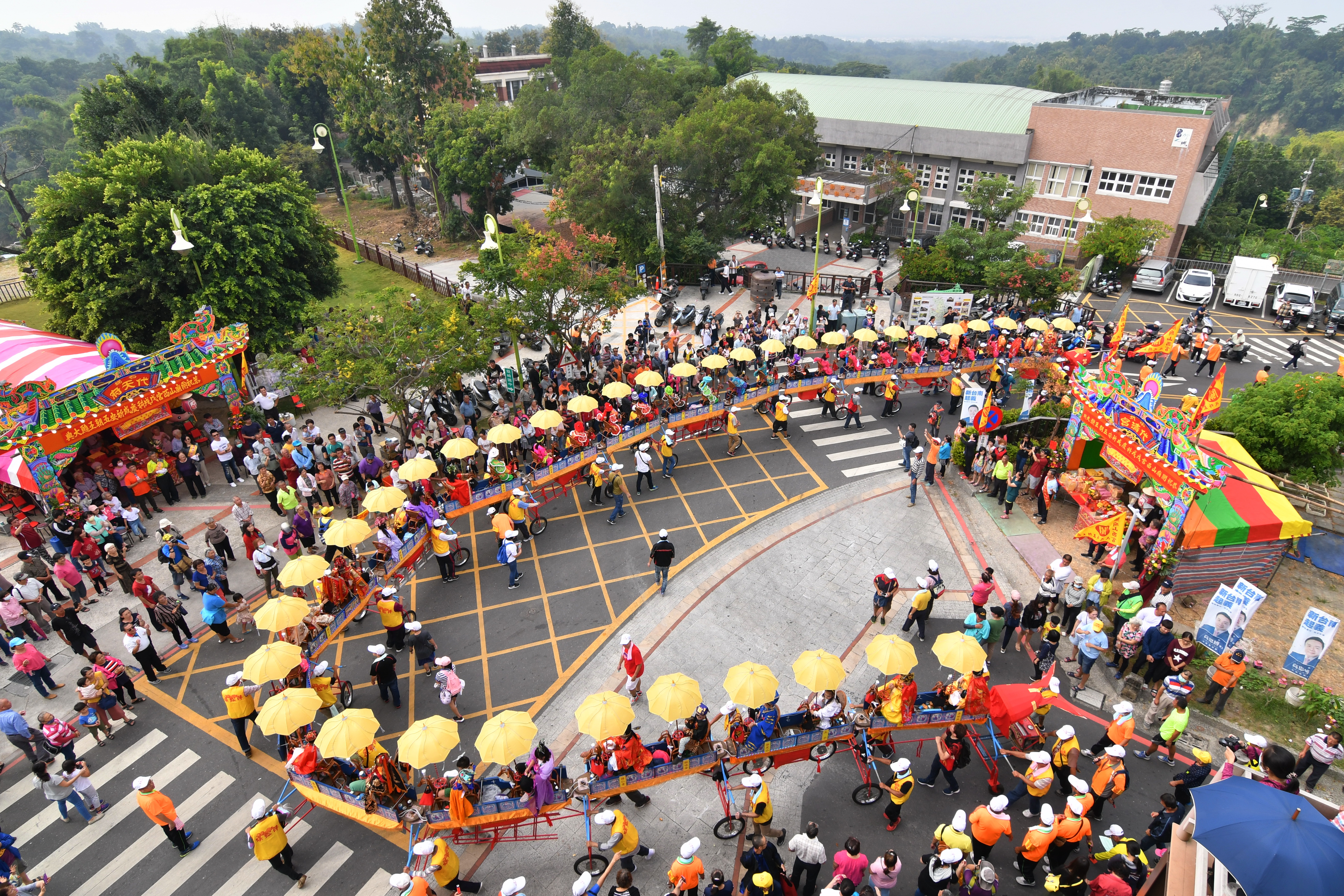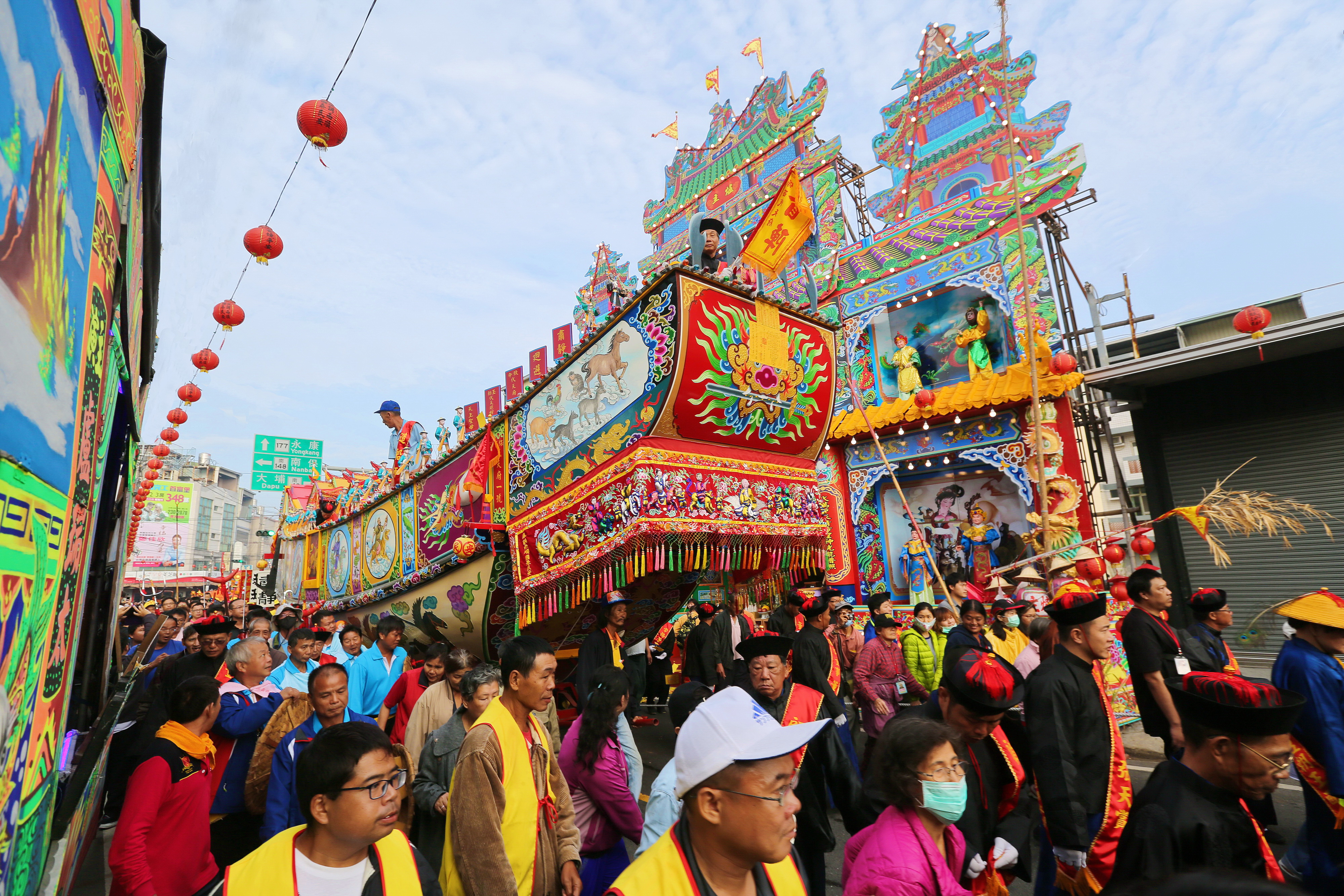 「架棚」係主辦廟境主神校閱所屬陣頭數月來的籌組情形與訓練成果之謂,通常於醮典前舉行,當天所屬角頭各自在廟前廣場自行找地方做整套的表演,如仁壽宮、大人廟均為如此,惟山西宮架棚係於王醮期間舉辦,採遊境的形式,由境內 10 里的陣頭前往新光里遊社。