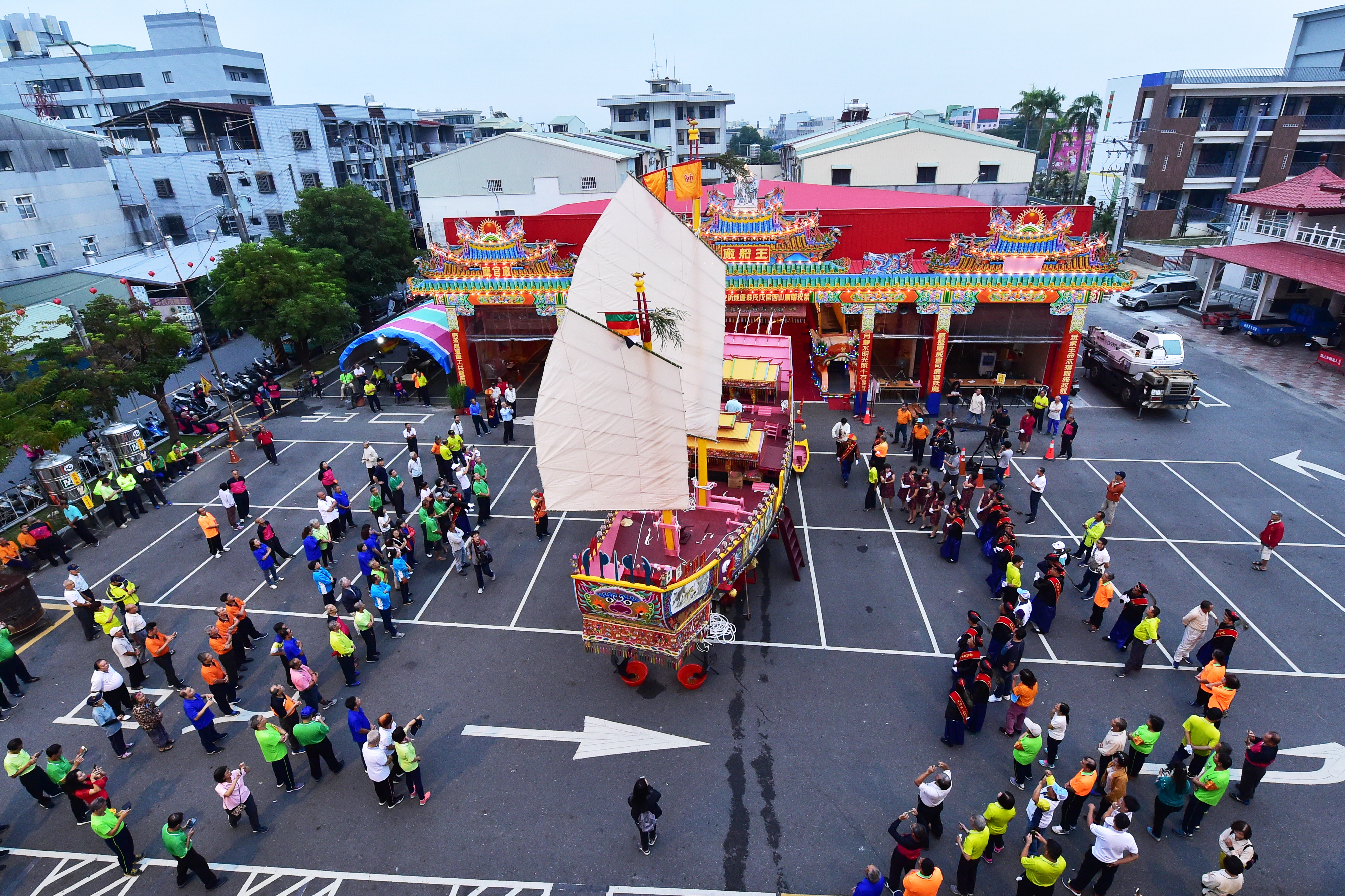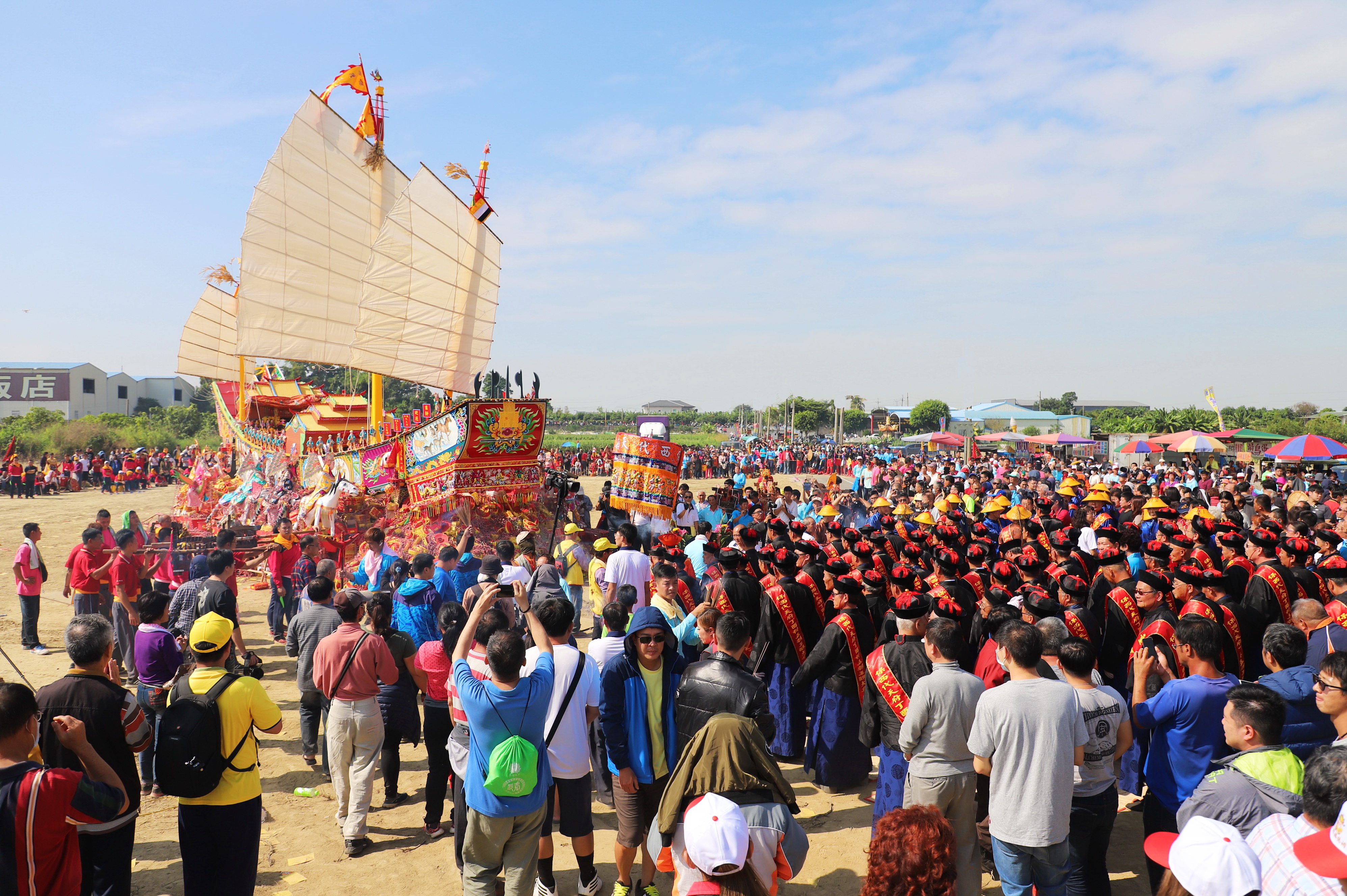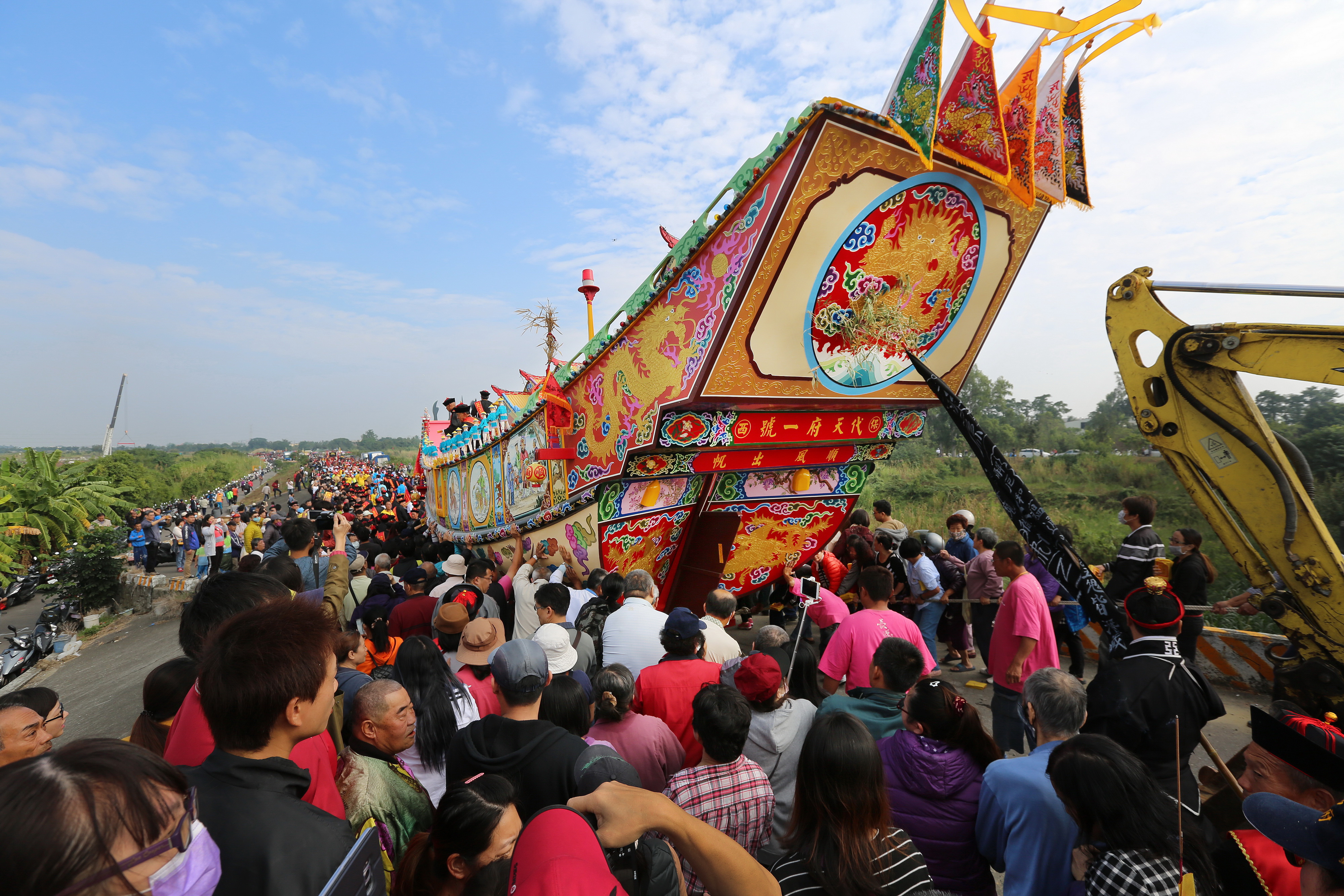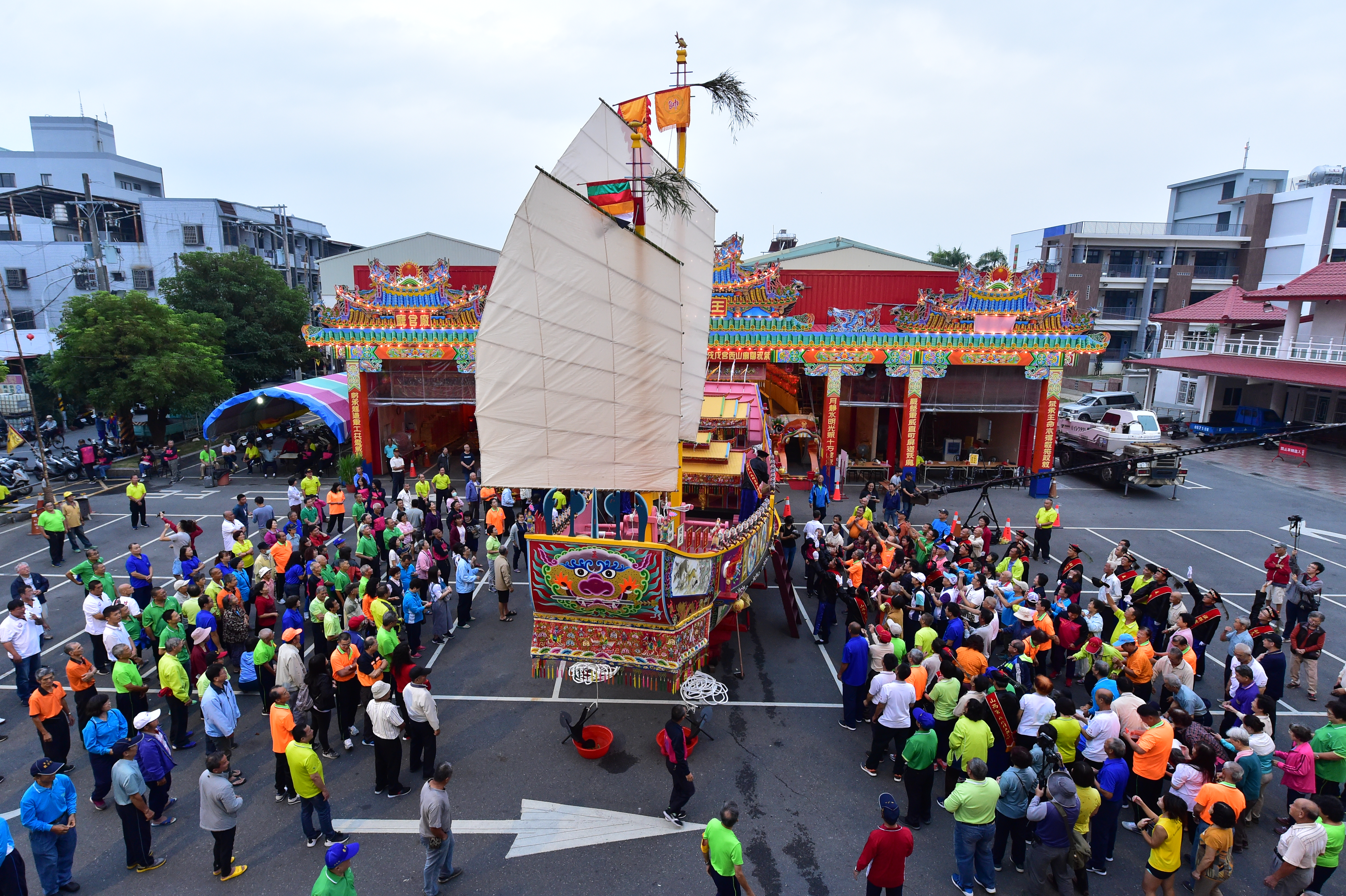 此為王船的下水典禮,主要儀程依序為:豎桅、升帆、開水路、拋碇。