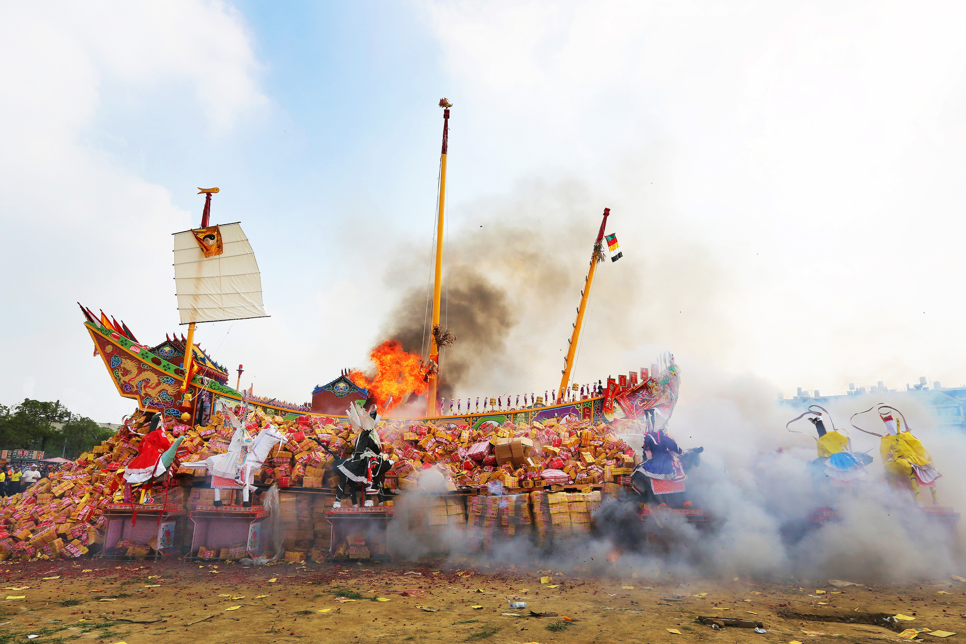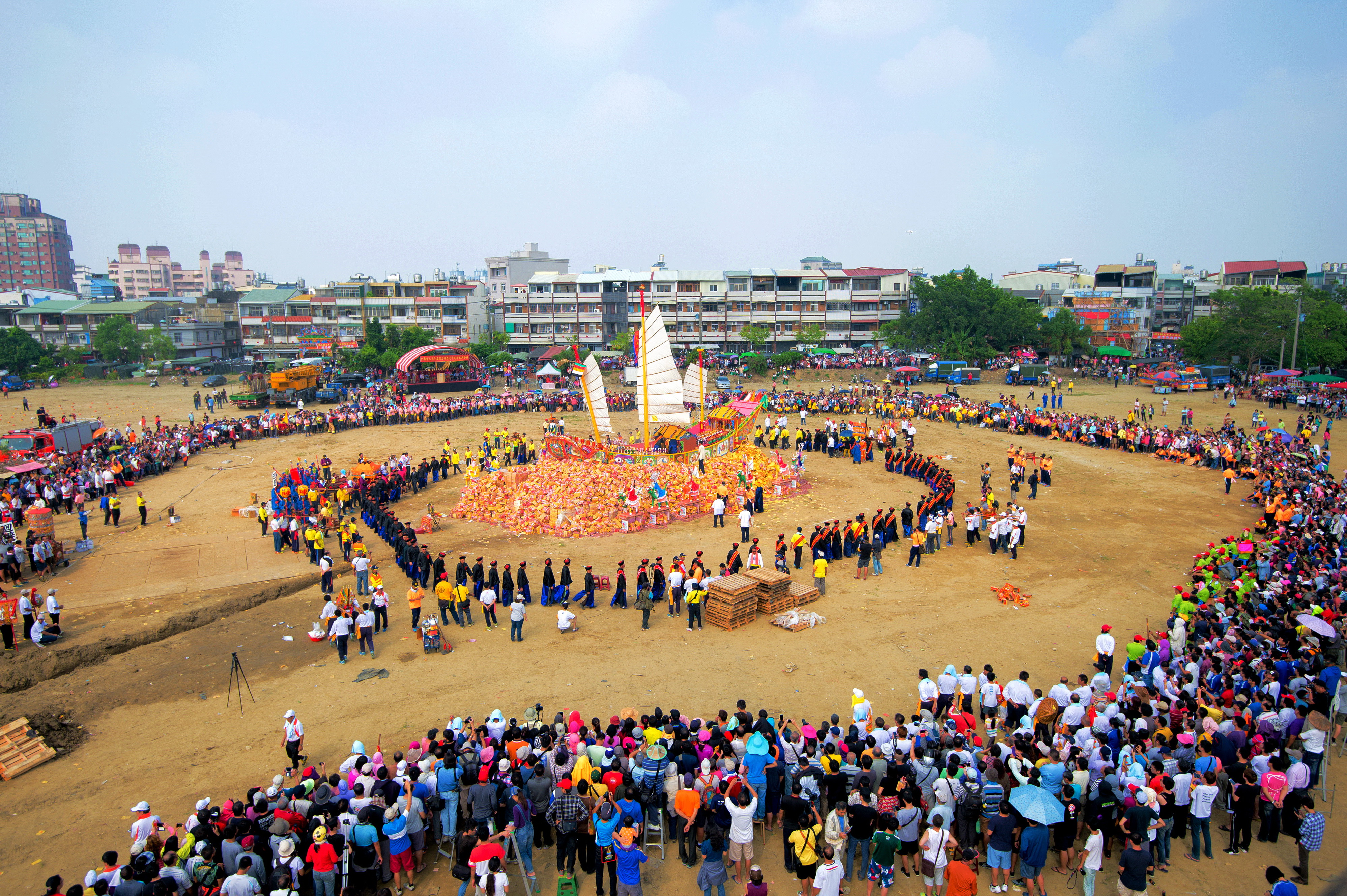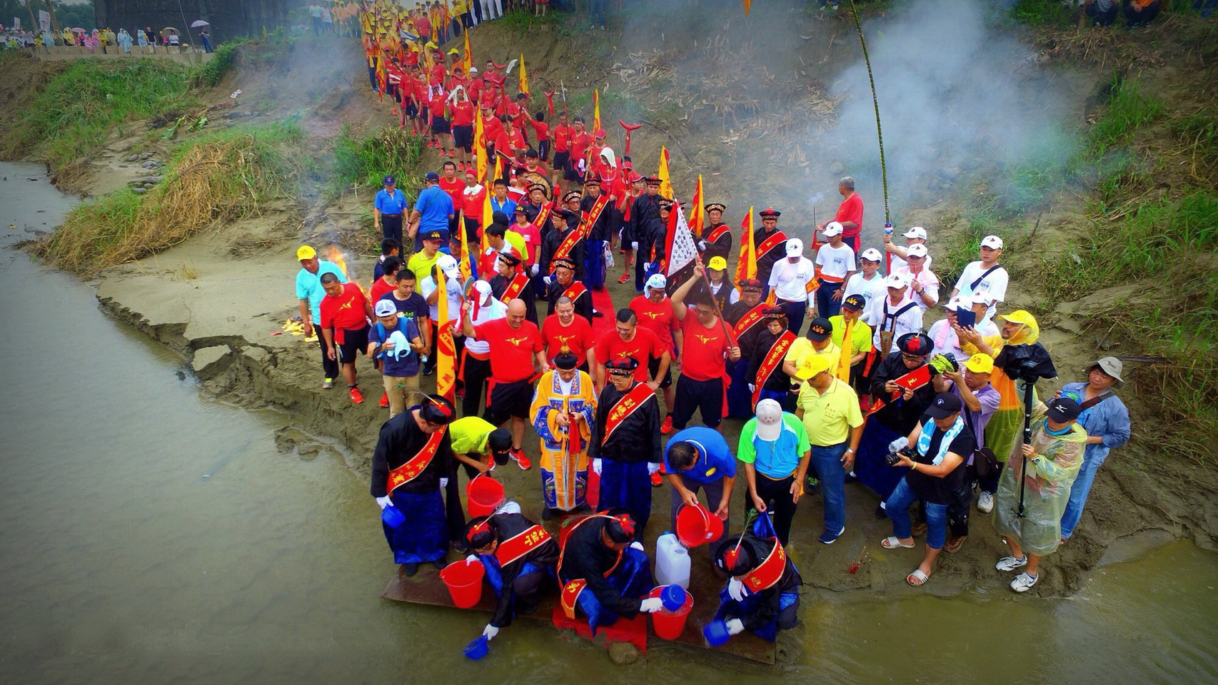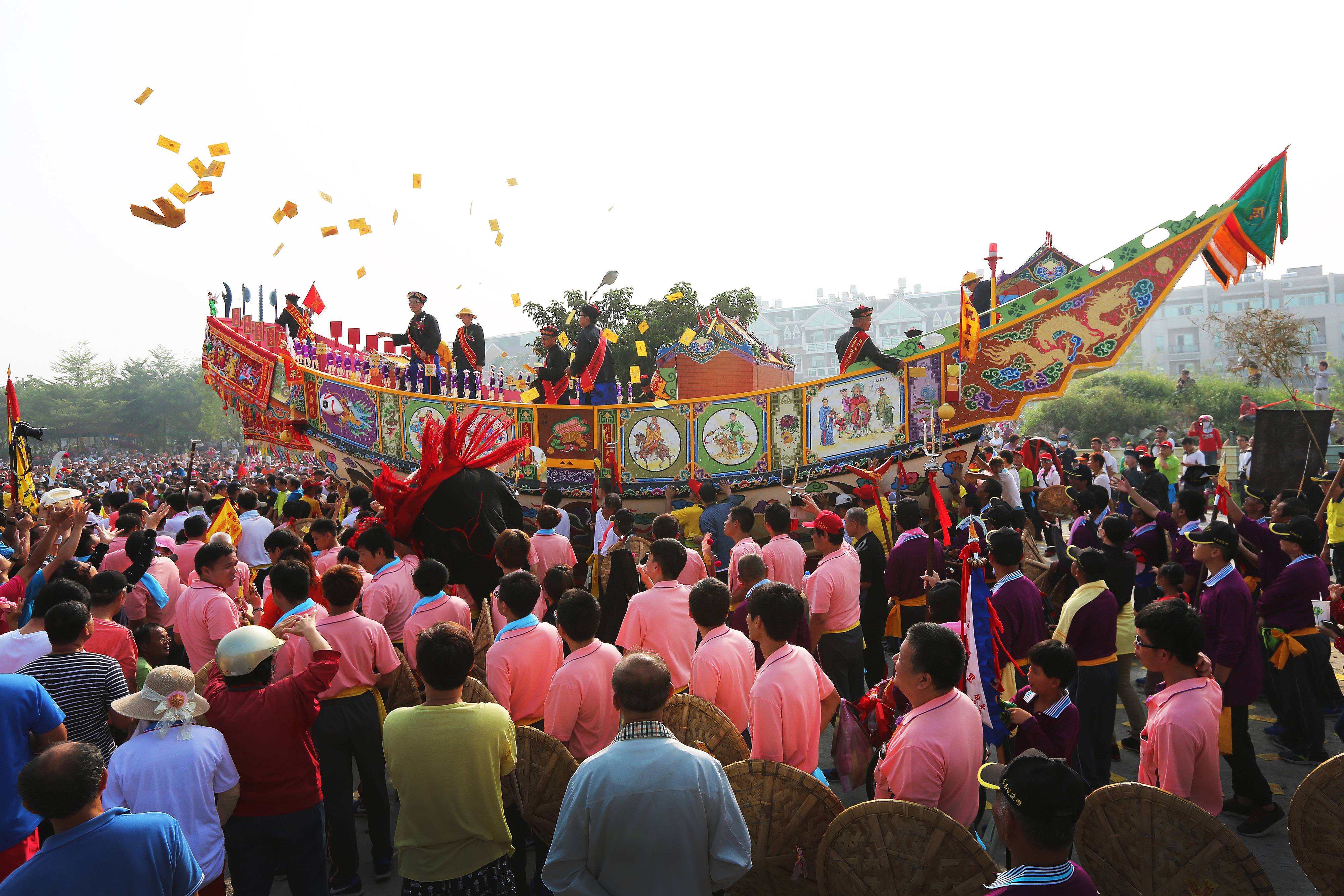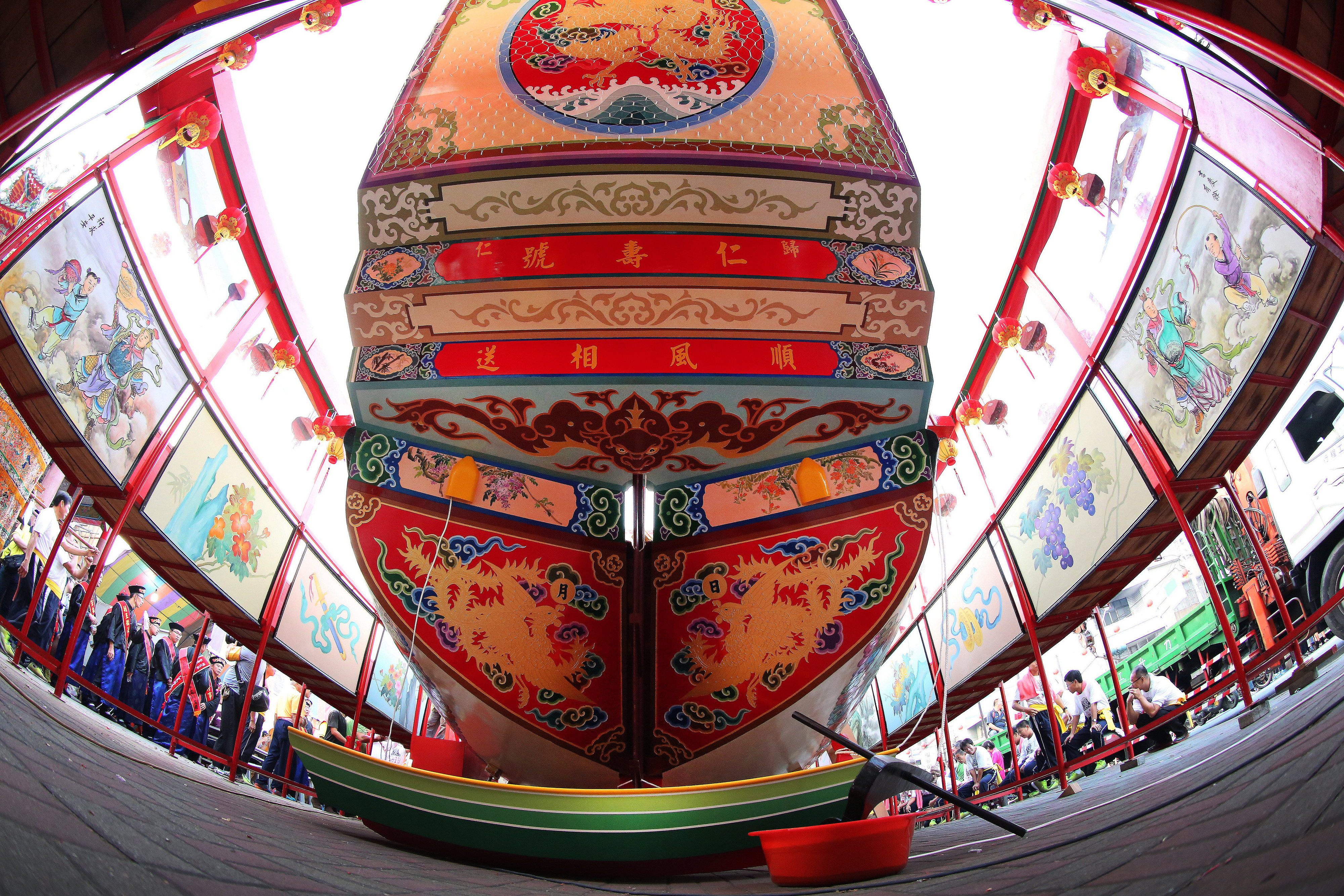 此為王船的下水典禮,主要儀程依序為:豎桅、升帆、開水路、拋碇。
