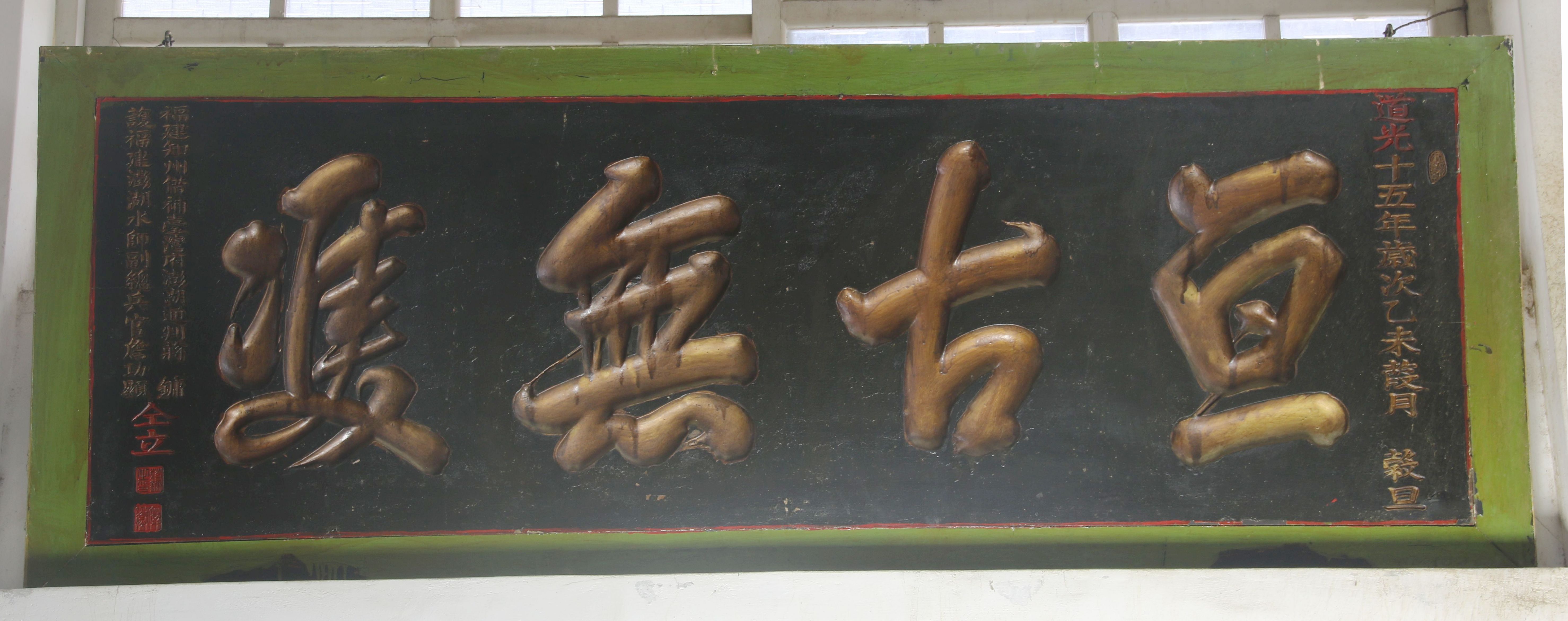 橫長形木匾,匾框拼接,面黑綠框無紋,字皆陰刻填金,中行書破鋒題「亘古無雙」,左「道光十五年歲次乙未葭月」,右「福建知州借補臺灣府澎湖通判蔣鏞 護福建澎湖水師副總兵官詹功顯 仝立」。「仝立」二字填紅彩。