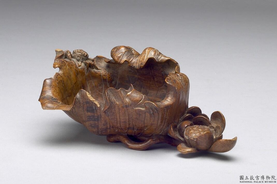 取竹根雕一捲掩荷葉為水盛,葉緣捲曲有蟲蝕,小蟹棲息於上;旁有一朵盛開過的荷花,花莖葉柄轉繞於器底,荷葉外壁有行書「三松製」刻款,即朱三松,明末竹雕世家「嘉定三朱」之翹楚。此件雕工精湛,從葉脈紋理到花瓣蓮蓬無一不細節考究,更展現「舒卷開合任天真」情態,顯示對花葉生態的入裡觀察。