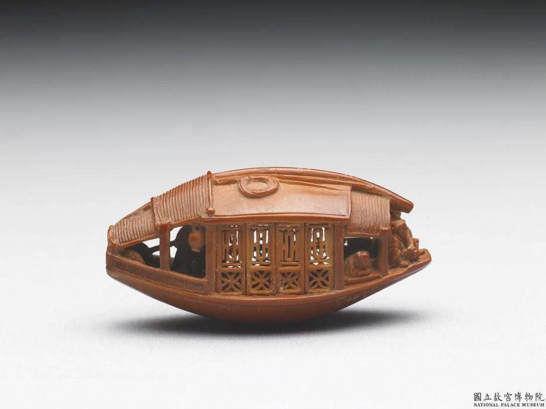 此件以橄欖核雕製蓬船,竹編蓬頂的船艙兩側,有可開闔的推窗,船上有船夫、童僕及船客共八人,艙中具桌椅,並陳列杯盤菜肴。船底以行書刻蘇軾〈後赤壁賦〉全文三百餘字,有清宮造辦處著名牙匠陳祖章乾隆二年(1737)的刻款。他將千古傳誦的東坡遊赤壁故事,藉由微小核舟中的人物情態、空間配置與細節刻劃,點出月夜泛舟的意象。