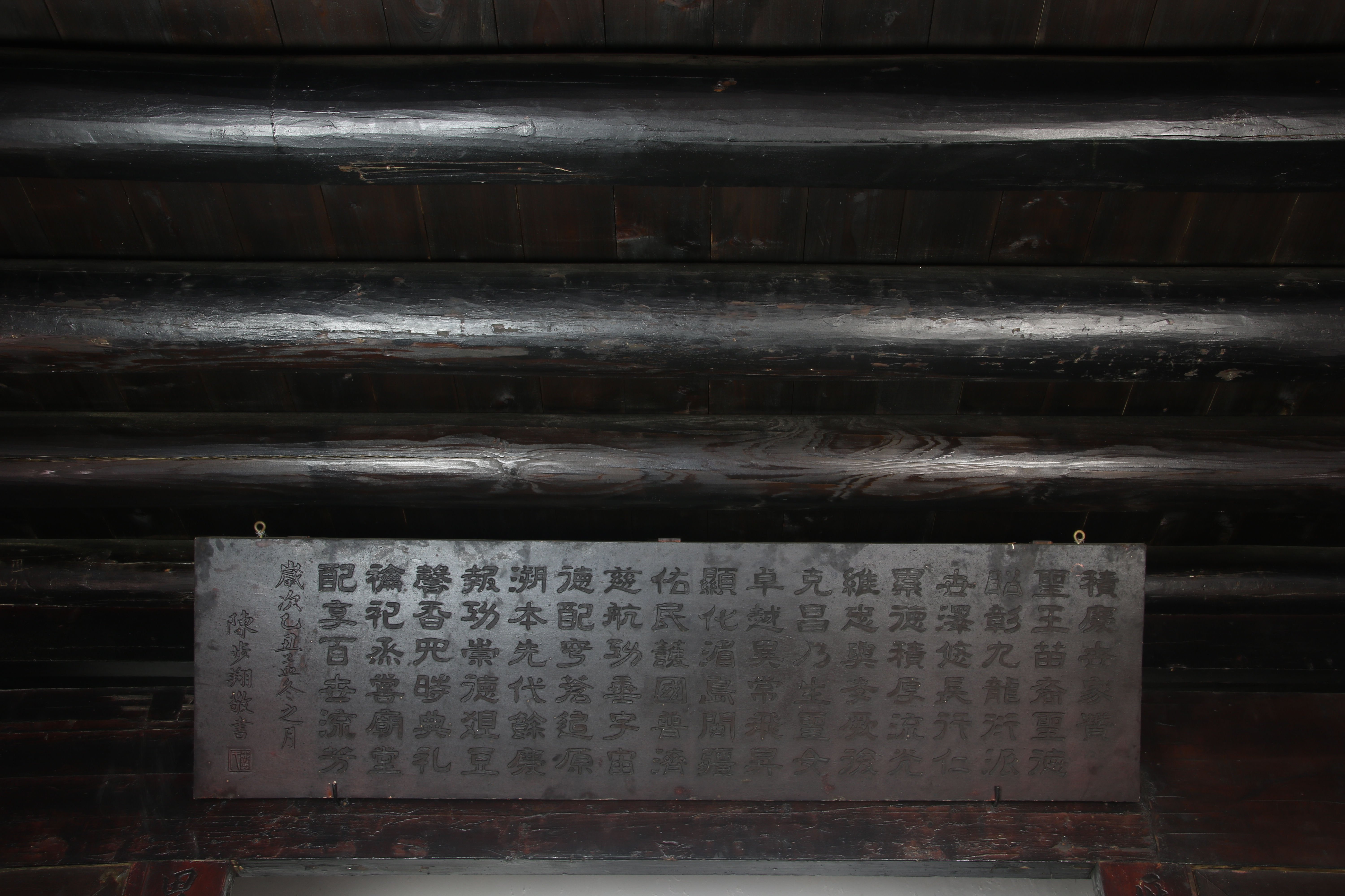 橫長形木匾,無拼接痕,背有三榫,匾面暗紅色漆燻黑嚴重,題文為淺陰刻平底,前題「積慶世家贊」,內文六字一列,共十六列,題:「聖王苗裔 聖德昭彰 九龍衍派 世澤悠長 行仁累德 積厚流光 維忠與孝 厥後克昌 乃生聖女 卓越異常 飛昇顯化 湄島閩疆 佑民護國 普濟慈航 功垂宇宙 德配穹蒼 追原溯本 先代餘慶 報功崇德 俎豆馨香 四時典禮 龢祀烝嘗 廟堂配享 百世流芳」;後落款為陰刻白描勾邊,題「嵗次乙丑年孟冬之月」、「陳步翔敬書」,後一方印「采蕋氏」。