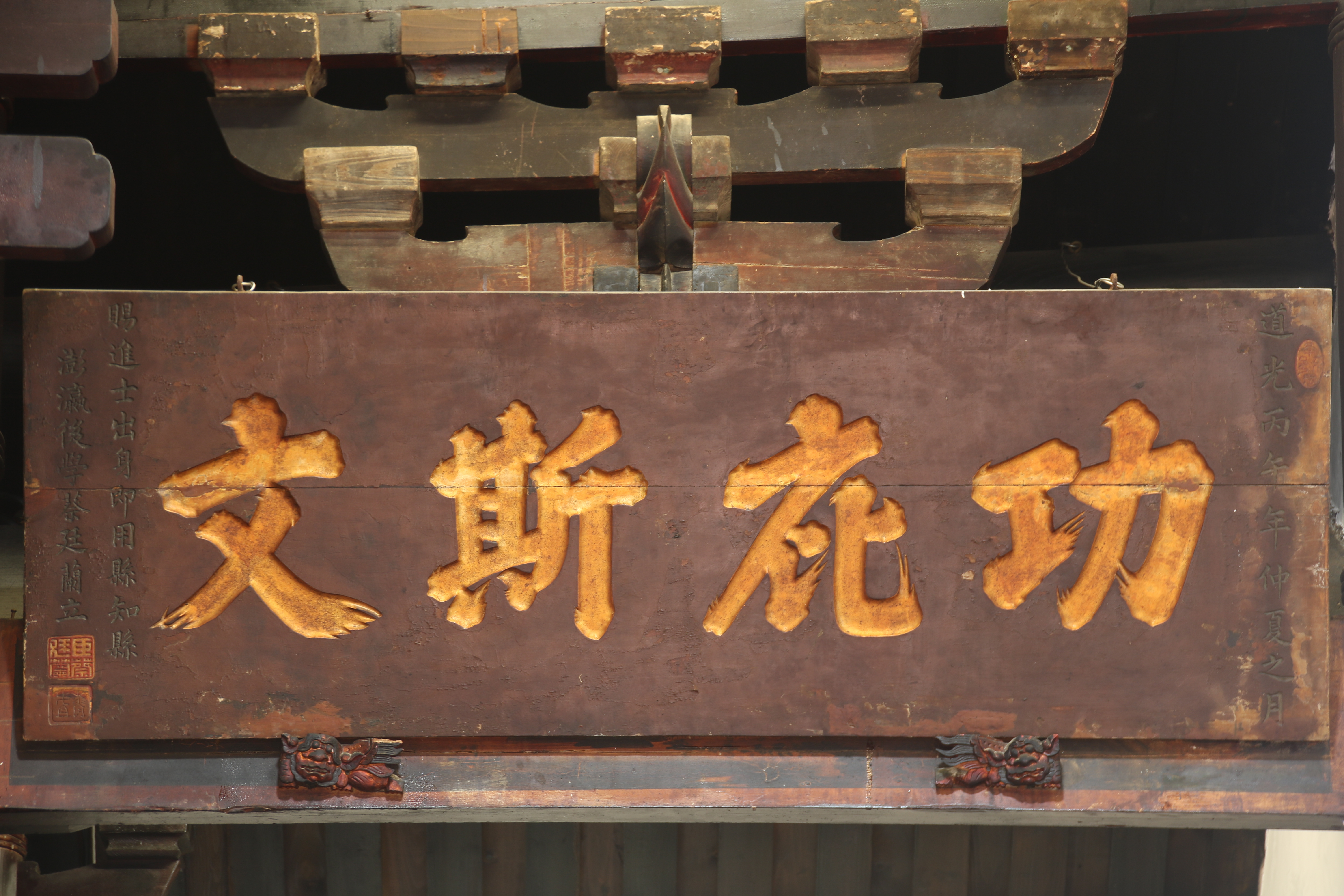 橫長形木匾,匾面二片拼接,呈深褐色,邊緣泛黃。題字皆笑竹(陰刻),中行「功庇斯文」四字填金漆貼金,字有破鋒,上下款施黑漆,上款「道光丙午年仲夏之月」,前有一橢圓印;下款「賜進士出身即用縣知縣/澎瀛後學蔡廷蘭立」,後有二方印「臣蔡廷蘭」與「香祖」。