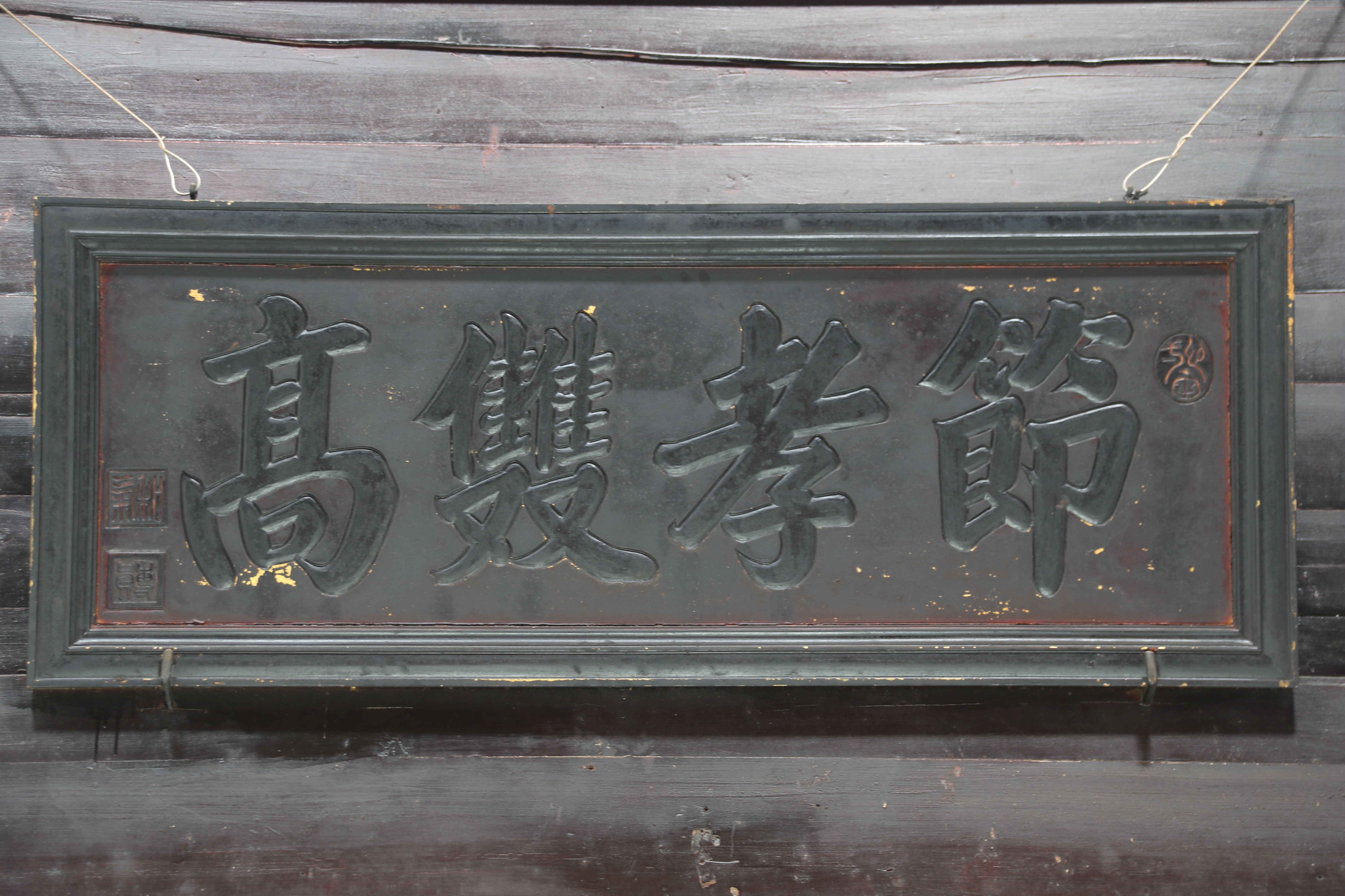 橫長形木匾,匾面燻黑,原似為暗紅色漆,外框簡素飾弦紋。中行陰刻白描勾邊,題「節孝雙(隻隻)高」,前一圓印,後二方印「和氣」與「團圓」。