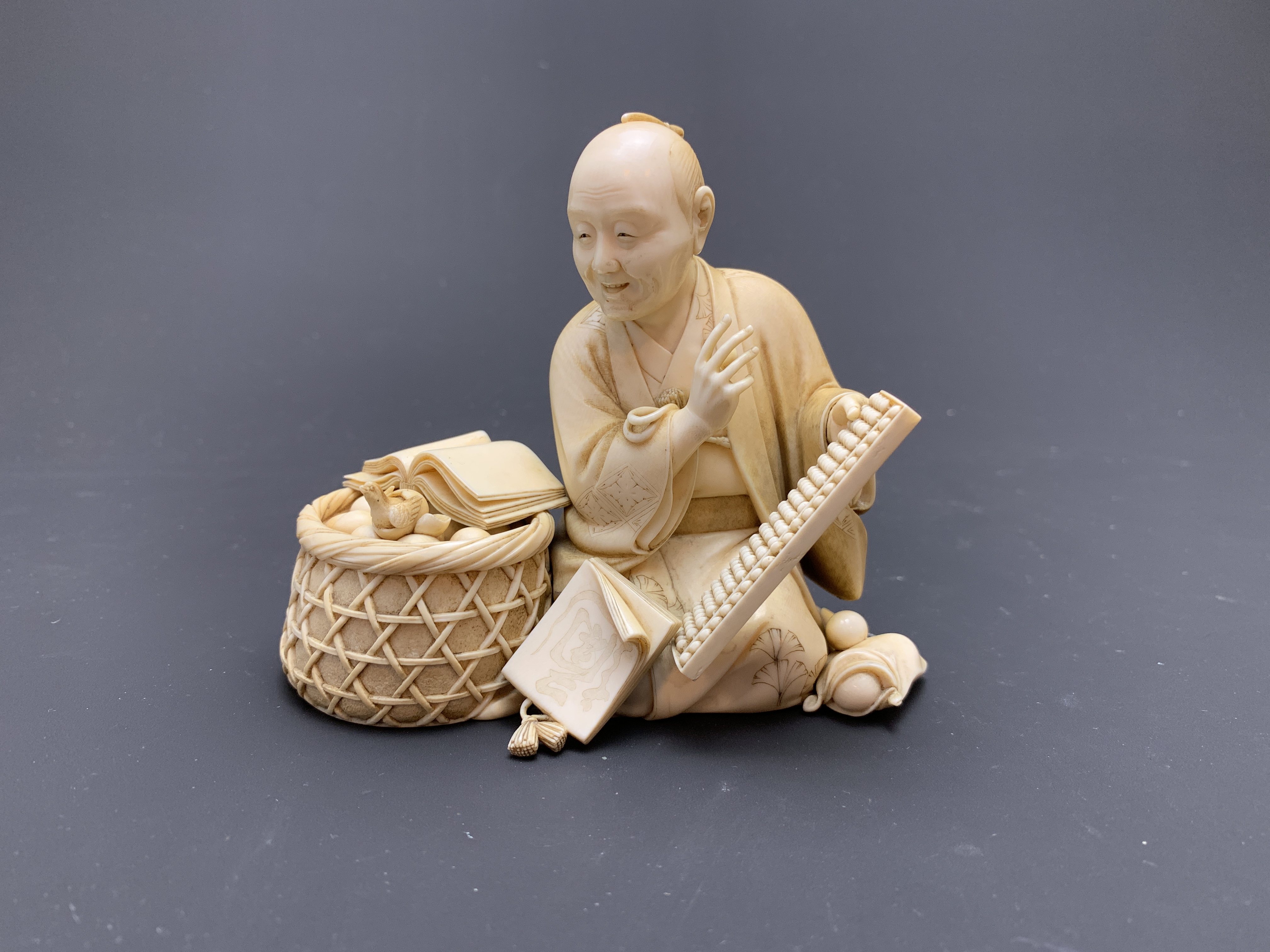 藝術家取象牙為材料,雕琢為賣蛋小販,小販為中年男性,面容清秀,表情喜悅,臉部肌肉飽滿,額頭、嘴角皺紋與略為凹陷的雙頰,刻劃極為自然。身著日本傳統服飾,服裝上精細雕琢不同花紋。跪坐,手持算盤,膝前有一疊紙張,幾頁紙張邊角向上卷起;一旁的竹籃內裝滿雞蛋,頂端恰有小雞破殼而出,另有一本翻閱至一半的書冊隨意置放於籃子上。作品底部有長方形開光,開光內有染為紅色的「宗孝」款。 本件作品刻畫出小販正在用算盤計算一日所得時,一旁的雞蛋竟有小雞破殼,藝術家以精湛的技藝,捕捉到小販看見新生命的驚訝與喜悅瞬間,整體造型頗具故事性,且各個部位、細節皆一絲不苟,連竹籃底部、延伸至底處的布料皆刻劃精細,款識周圍更有設計獨特之紋樣,加之象牙因年代久遠而形成的米黃色澤與溫潤包漿,更令本件作品在趣味之餘,又增添古樸雅趣。 日本自明治維新以來,即推崇「匠人文化」,「匠人精神」更是日本社會走向繁榮的重要支撐。從本件藝術品精湛的雕琢技藝,便顯露出藝術家非常敬業、追求極致的專業精神,不僅令人敬佩,此種精神更值得台灣藝術家學習。