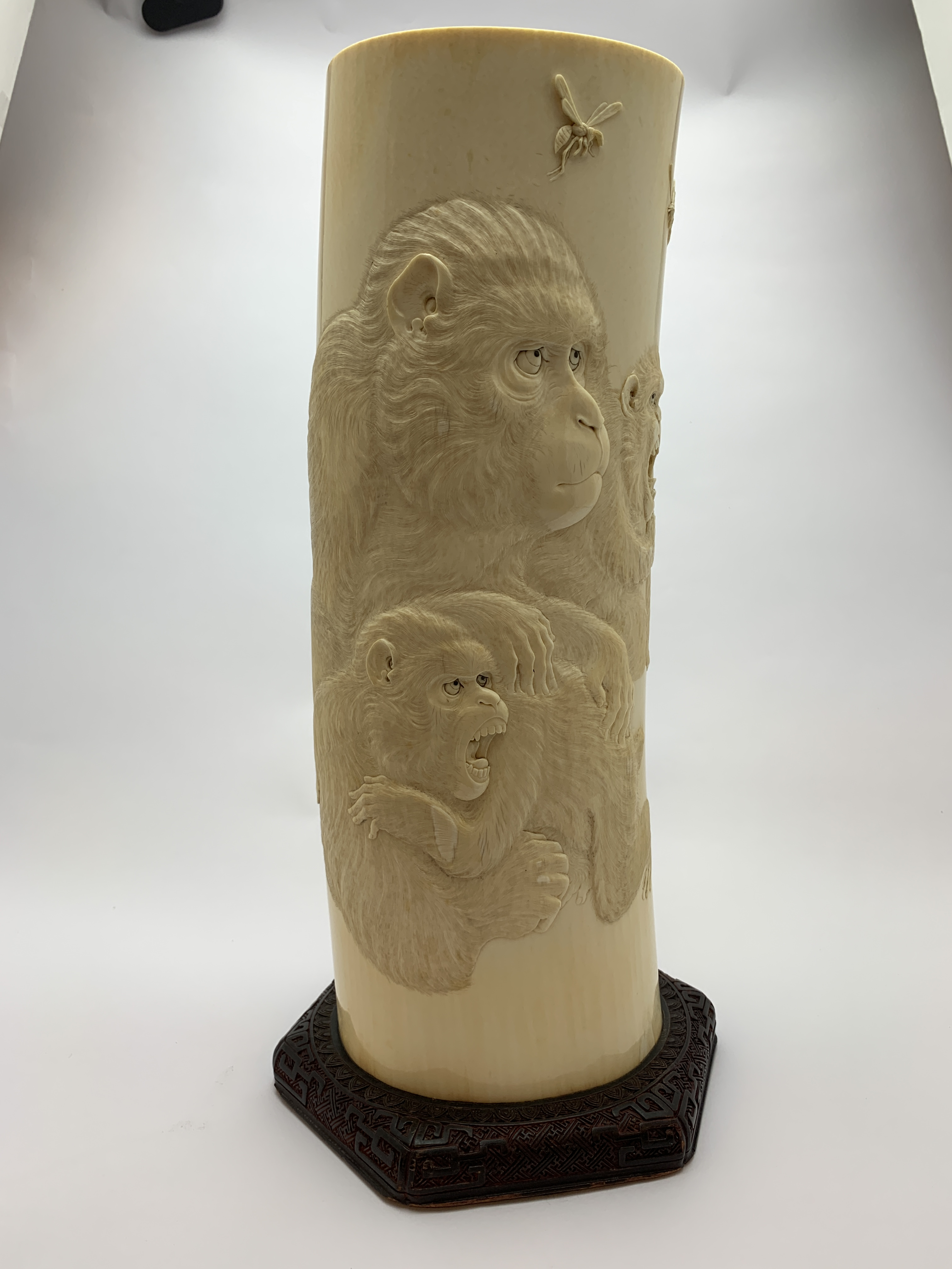 本件作品為富岡所做,取一截象牙為主體,表面浮雕猴群為飾。一小猴面容驚恐,投奔碩大母猴的懷抱中,母猴神情無奈,雙目直盯上方,原來是因為有數隻蜜蜂在空中飛舞。其旁另二猴亦面露恐懼,大眼上望,嘴大張,獠牙俱露。筒身下方空白處有「富岡」方印款。 整體雕琢工藝精巧,猴子的面部表情刻劃生動,傳神地表現出面臨蜂群來襲時的驚訝、害怕與無奈感,藝術家更以獨特的雕刻技法表現出猴子絲絲分明、纖細柔順的毛髮,各種質感精準的呈現,彷若真實的猴群躍然眼前,令人對藝術家高深之雕刻功力深感敬佩。 猴子,在日本人眼中是具有靈性的動物,亦會虔誠地祭祀,希望能帶來幸福、驅除災禍。許多神社和佛教寺院皆有猴之形象。此外,日本有許多關於猴的民間傳說和成語,如「猿蟹合戰」、「犬猿之仲」。而日本著名的「三猿」分別表示「不看」、「不聽」、「不言」,意指為人處事要言行謹慎。而本件作品以蜜蜂和猴子為主題,則有取其諧音「封侯」之意。