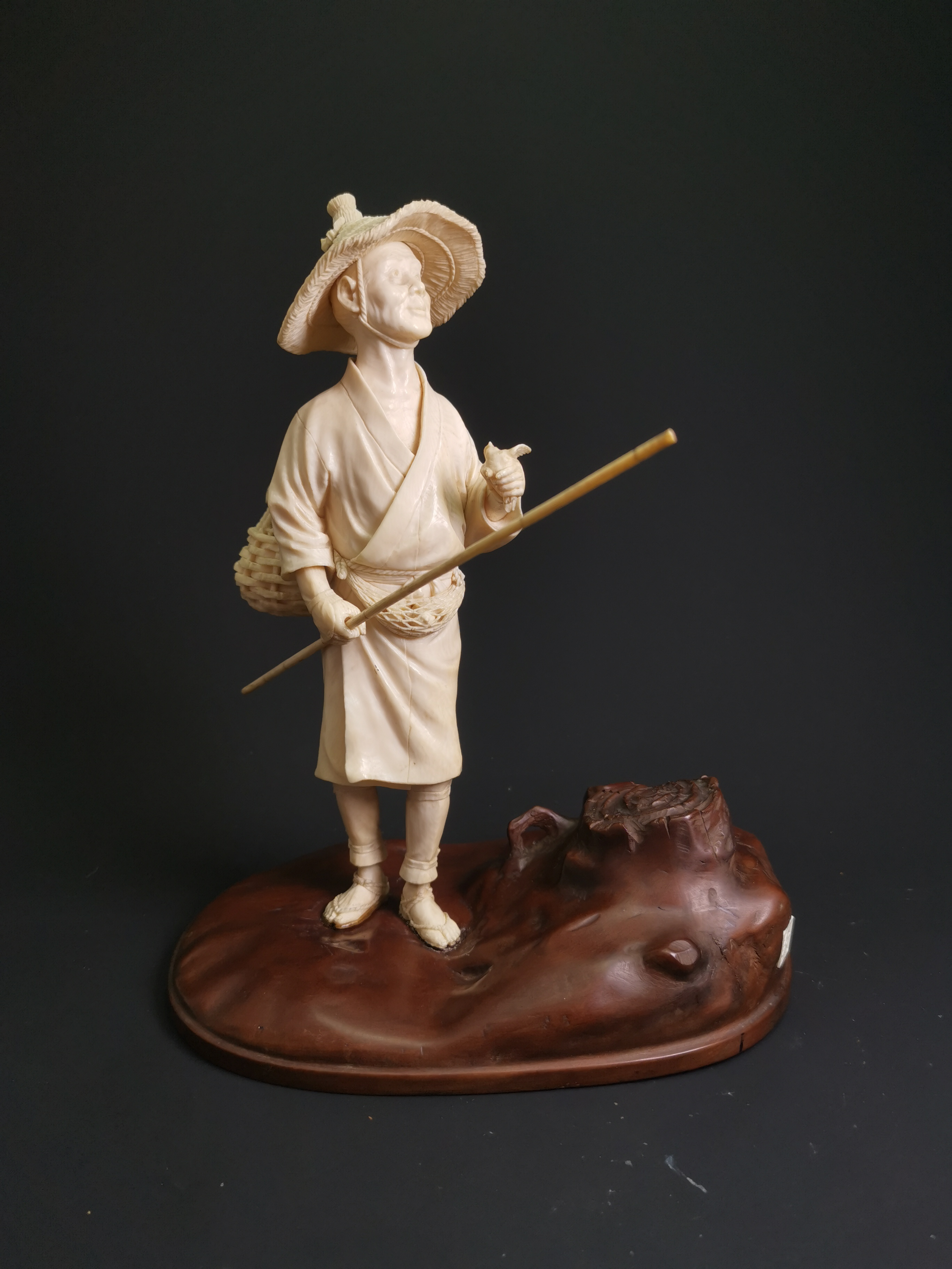 作品以捕鳥人為主題,中年男子頭戴斗笠,身著輕便服飾,腰間繫網袋,袋內有補捉到的小鳥,後背籐籃,右手持長棍,左手緊捉鳥兒,抬頭仰望天空,似在觀察其他可捉的鳥兒,站立於木座上。木座雕琢成樹樁造型,側邊有一方形小開光,鑲嵌象牙「互道」款。 整體體量碩大,用料甚巨。藝術家雕琢細膩,將捕鳥人神情專注、殷切渴望再捕得鳥兒的表情刻劃傳神。其餘細節亦分毫不差,斗笠細密編織的紋理、服裝布料光滑柔順的質感都在藝術家的巧手下鉅細靡遺的呈現,更令人感到驚奇的,是在那以精湛技巧鏤雕的網袋中,竟還有鳥兒置身其中,如此精巧的細節著實令人讚嘆不已。日本明治時代藝術家追求完美、極緻的敬業精神,非常值得現代的藝術家揣摩參考。