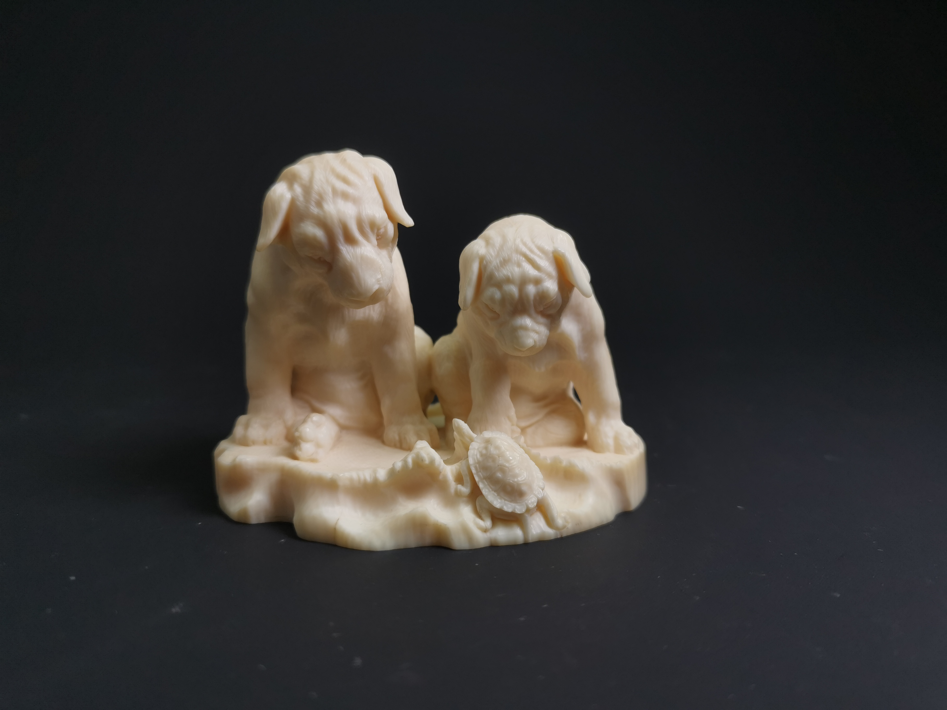 本件作品以動物為主題,兩隻小狗坐於岸邊,低頭垂看一隻正往岸上攀爬的烏龜。小狗垂耳,凸吻,臉部皮膚呈皺褶狀,身軀飽滿,樣貌憨厚可愛。岸邊的烏龜小巧玲瓏,伸長脖子,四肢奮力往上爬,龜殼獨特的花紋雕刻仔細,並營造出堅硬的質感。岸邊因烏龜的動態而激起不規則的波滔與浪花,底座下方有「春光刀」款識。整體雕琢細膩,狗兒纖長細軟的毛髮栩栩如生,蓬鬆柔順感彷彿觸手可及。烏龜體量雖小,細節營造毫不馬虎,肌膚與龜殼不同的質感、紋理皆雕琢的分外細膩,精湛的技巧令人敬佩。 許多動物在各個文化中都有不同的意涵。狗,在日本因其忠誠而備受稱讚,且日本人認為牠們的吼叫可以驅趕鬼怪。而烏龜則和中國文化相似,有著長壽健康、幸福等意義,兩種意涵相結合,賦予此件藝術品長壽平安之意。