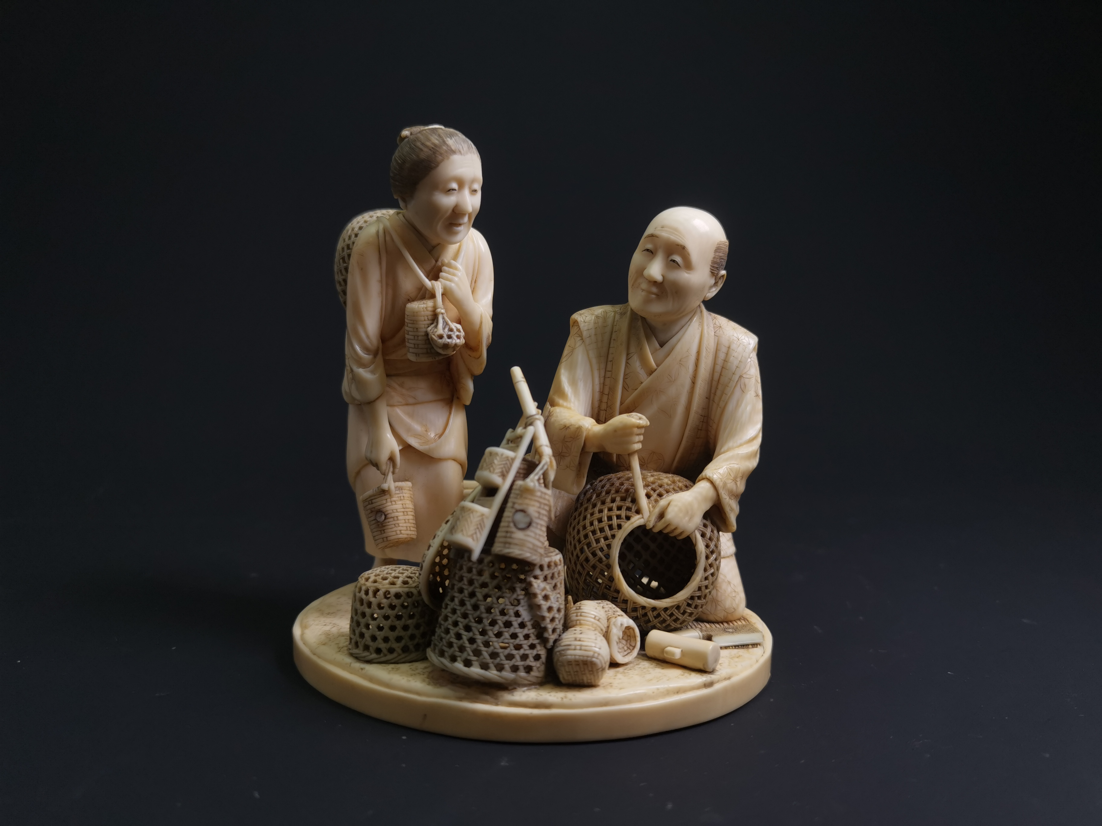 本件作品以明治時期生活中常見的景象為主題,中年男性小販身著傳統日本服飾,腰帶上插著不同工具,跪坐於地,地上鋪有一小塊竹編地墊,手持工具正在修理竹籃,小販笑臉盈盈,望向另一婦女。婦女似是前來購買或維修竹籃的顧客,微微彎腰與小販相談甚歡。婦女頭梳髮髻,髮絲細密工整,身著輕便的傳統服飾,手持小竹籃,背後背著一大一小竹籃,足蹬木屐。兩人前方堆置著大大小小的各式竹籃,小販周邊散落刀、斧等器材,身後為打開的木箱,箱中放著各式修整竹籃所需刀具。 整體內容豐富,琢工細膩,各個物件、細節皆細膩表現,層層疊疊,需要耗費極大心思仔細雕琢的竹籃,不僅能看出藝術家的耐心與毅力,更是藝術家深厚技巧的表現,極為精湛。本件作品不僅具有藝術性,還可以看出日本當時的買賣習慣、社會日常生活,兼具歷史、文化與藝術價值。