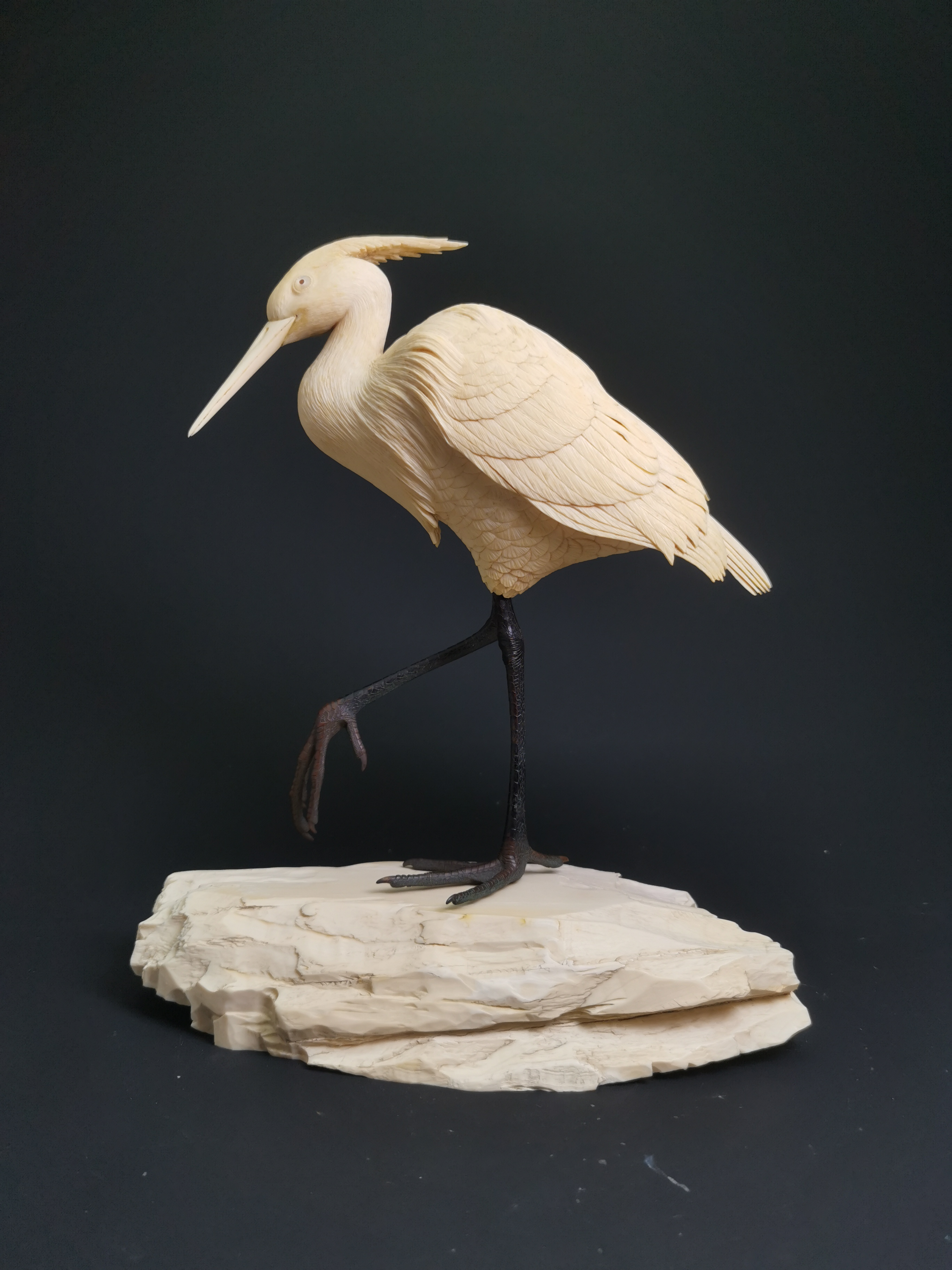 作者以生活中常見的鷺鷥為題材雕琢,鷺鷥曲頸挺胸,目視前方,圓眼長喙,背部隆起,雙翅收攏。羽毛根根分明,繁而不亂,藝術家以精湛的技巧,表現出鳥羽細柔、蓬鬆質感。鷺鷥雙腿纖細修長,單腳立地,站於半截樹幹上,另腳向前彎曲,鳥爪微微收攏,姿態活潑而不呆版。樹幹底面陰刻「光廣刀」之款識。 整體雕工精細,動物的姿態、特徵皆掌握準確,且毫不呆版。細觀之,藝術家以獨特的刀法,將鷺鷥身上一絲絲纖細的毫毛盡皆刻劃,表現出巧妙、純熟的雕刻技藝,令人讚嘆。