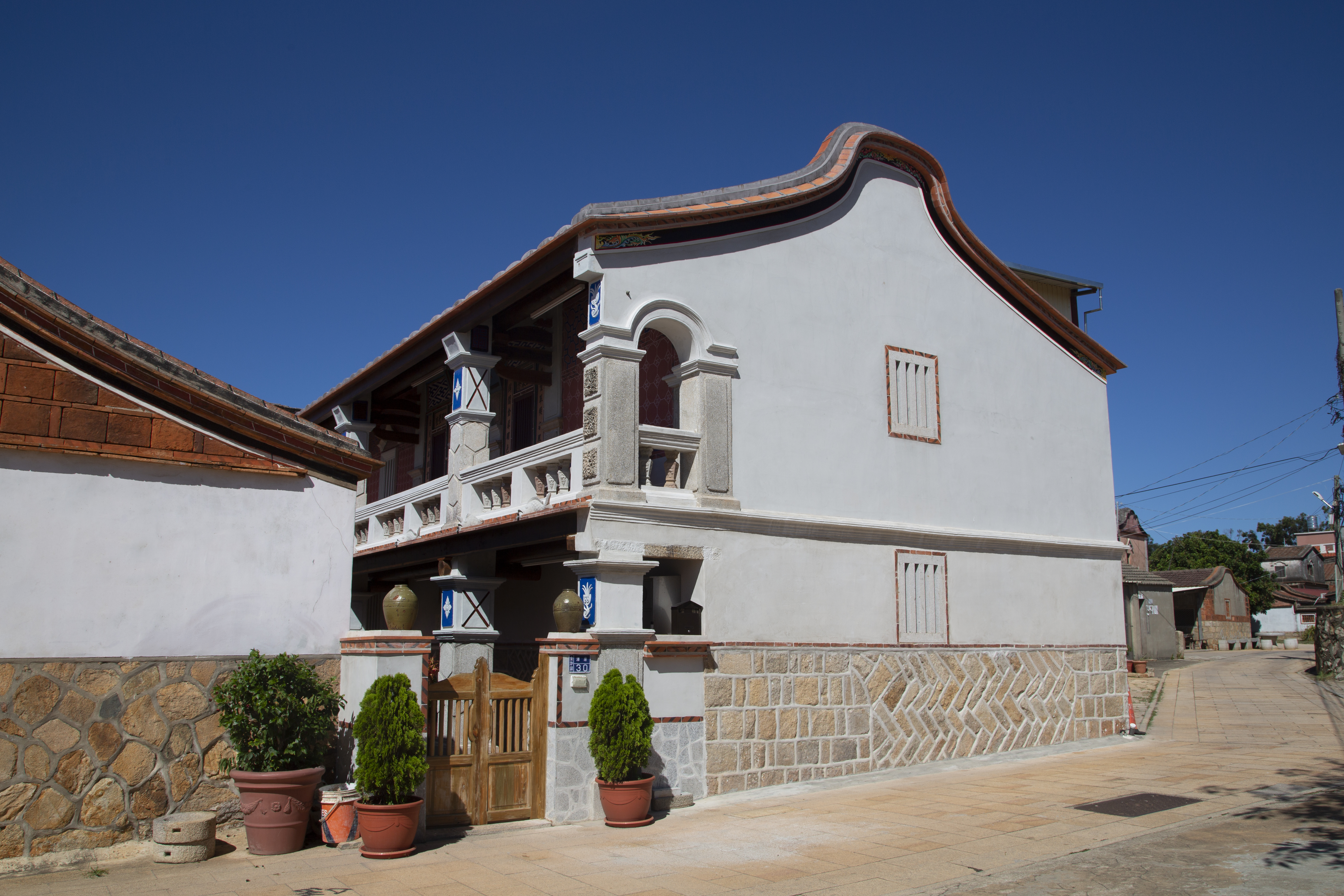 建築為三開間之五腳基洋樓,採傳統閩式二屋面,屋脊形式為圓脊。外牆立面牆身材料下緣為石塊砌築,兩側丁砌、中間為人字砌;上半部壁面抹灰,背立面置有「反共抗俄」之標語。 一、二樓廊柱有六角龜紋裝飾,表面飾以牡蠣殼灰泥;兩側邊柱表面則裝飾則有方形水泥漿蟲蝕裝飾面。廊柱頭有天官賜福與壽字,或是象徵吉祥的花草圖案作為柱頭裝飾。二樓女兒牆欄杆為三角柱體,表面可見紅色顏料。二樓廊柱表面與一樓同為六角龜紋洗石子裝飾面,兩側廊柱有拱圈泥塑線腳與牆體銜接,增加側立面裝飾之豐富性。