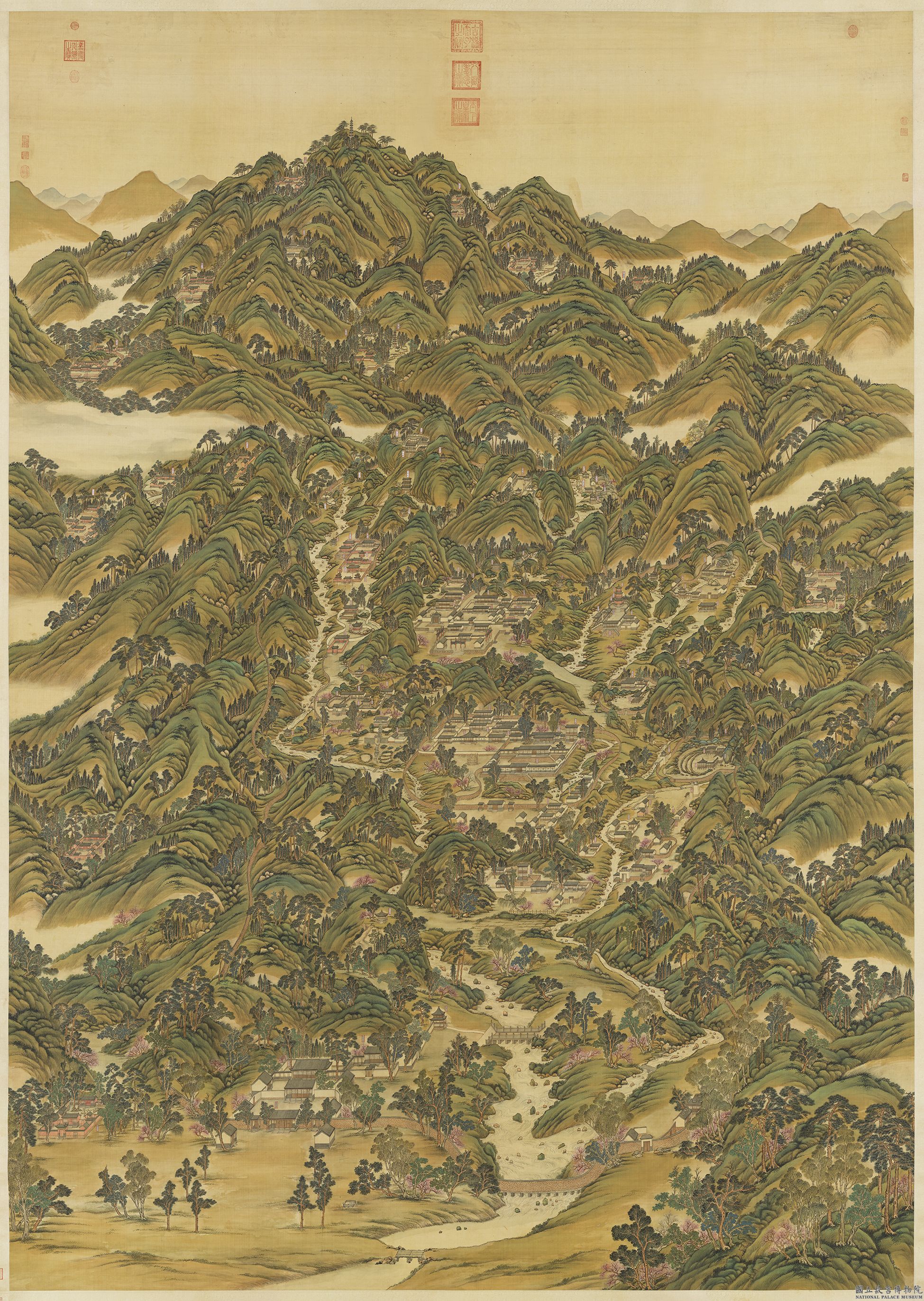 盤山位於天津市薊縣境內,地處清朝皇帝往返東陵祭祖必經之地。盤山最早建成的「御定內八景」,另有一些名剎被列為「御定外八景」,兩者合為「山莊十六景」。乾隆十九年(1754)《欽定盤山志》纂修完成,將所有名剎勝景收入,以上所述建築群皆可在畫面找到。盤山以自然景色著稱,奇峰怪石、古寺、名園薈萃。乾隆皇帝曾多次遊歷盤山行宮,留下歌詠詩作一千餘首。此圖採俯瞰角度,山崖層疊層次分明,松樹遍布山間,峰巒之間名勝古蹟、行宮屋宇、亭臺寺廟安插位置妥當,近大遠小,兼得深遠及高遠之趣。此軸為宮廷畫家合作繪製,紀錄乾隆時期國家盛世清明。據清宮造辦處《活計檔》記載,乾隆四十四年(1779)曾傳旨由宮廷畫家姚文瀚(活動於1743-1788)負責建築,袁瑛(活動於1765-1785)繪山石樹木。