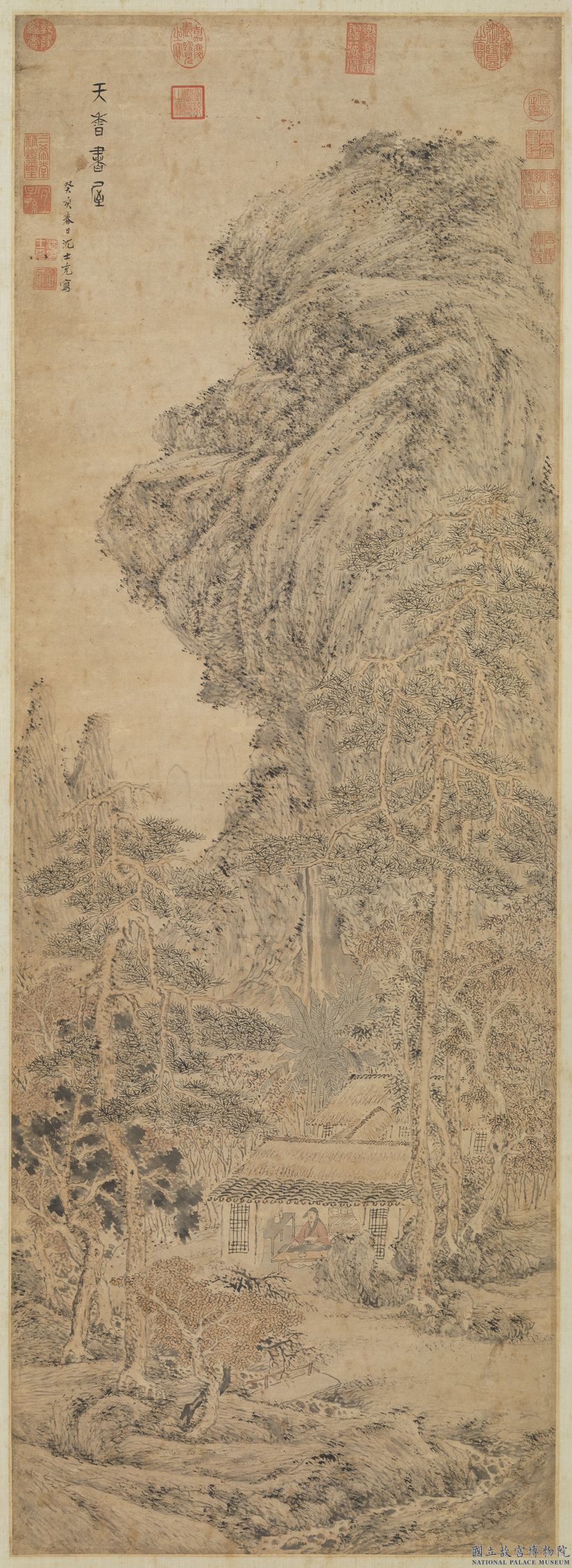 沈士充,生卒年不詳,字子居,華亭人,活躍於1607至1640年間。出宋懋晉(?-1620年以後)之門,兼師趙左(?-1633年以後),所作山水,丘壑蒨葱,皴染淹潤。 本軸於明代被視為王蒙(1308-1385)風格的代表畫作。王蒙原作目前雖未見真跡流傳,然傳稱作品,或仿王蒙風格作「天香書屋」作品不少,沈士充此作亦為其中一例。 畫中主山自右方巃嵸而起,懸泉挂於其左,近景小屋前澗水迴環,叢陰蒙羃,並有花樹植於樹隙蕉陰,屋內文士坐於几前撫琴,琴前方擺置香爐,其後書櫥一架,與畫題「天香書屋」正相合。 全畫以枯勁之筆,畫山畫樹。山勢峻偉,林木扶疏,畫中人物、屋舍、文房,描繪不失細膩,布置精當,意在王蒙而自出面目,可為沈士充立軸代表佳作。