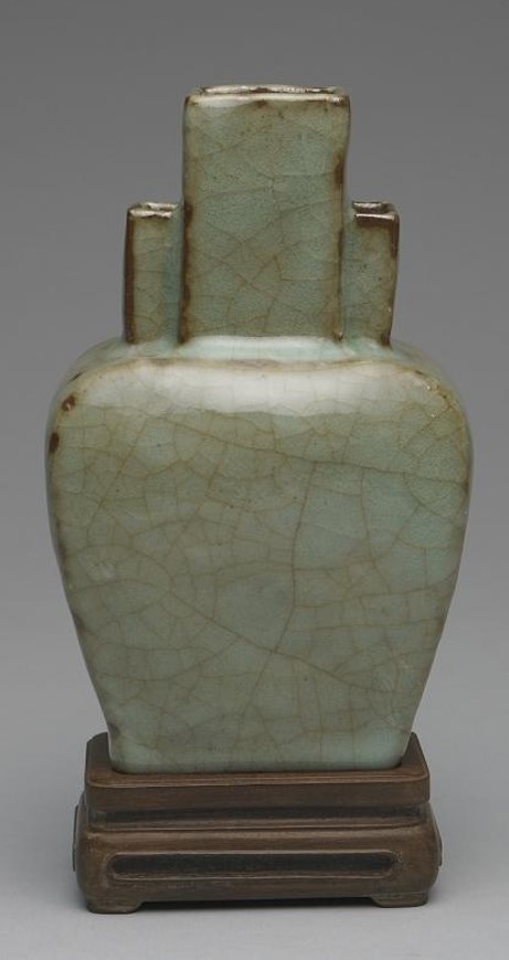 此器呈扁形方壺,上開三豎孔,中間較大,兩側稍小。腹部扁碩,上豐下斂,平底,淺圈足。通體施青瓷釉,釉色灰青,邊稜釉薄處,現出赭色邊間雜赭色斑點。施釉至足際,足圈無釉處,加塗深色護胎汁。底面鐫刻乾隆皇帝〈詠官窯方缾〉御製詩。詩末署「乾隆辛亥御題」紀年銘(乾隆五十六年:1791),並落「古香」一枚鈐印。