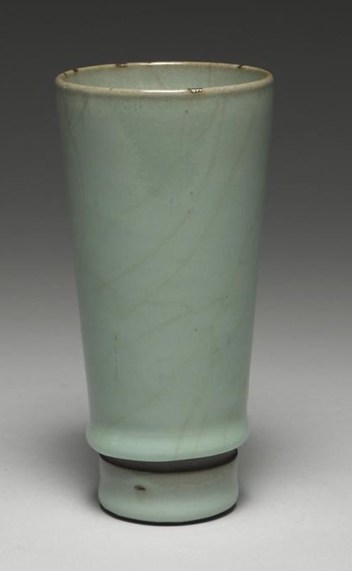 此器呈圓筒形,上豐下斂,平底內挖成淺圈足。胎骨稍厚,上施濃厚粉青色釉,口沿釉薄,現出土青色邊,足上一圈無釉,且於上緣積留有濃釉垂淌痕跡。施釉至足邊,底面足緣無釉處,加塗深赭色護胎汁。底面鐫刻乾隆皇帝〈詠官窯筒器〉御製詩。詩末署「乾隆戊戌夏御題」紀年銘(乾隆四十三年,1778),並落「太璞」一枚鈐印。