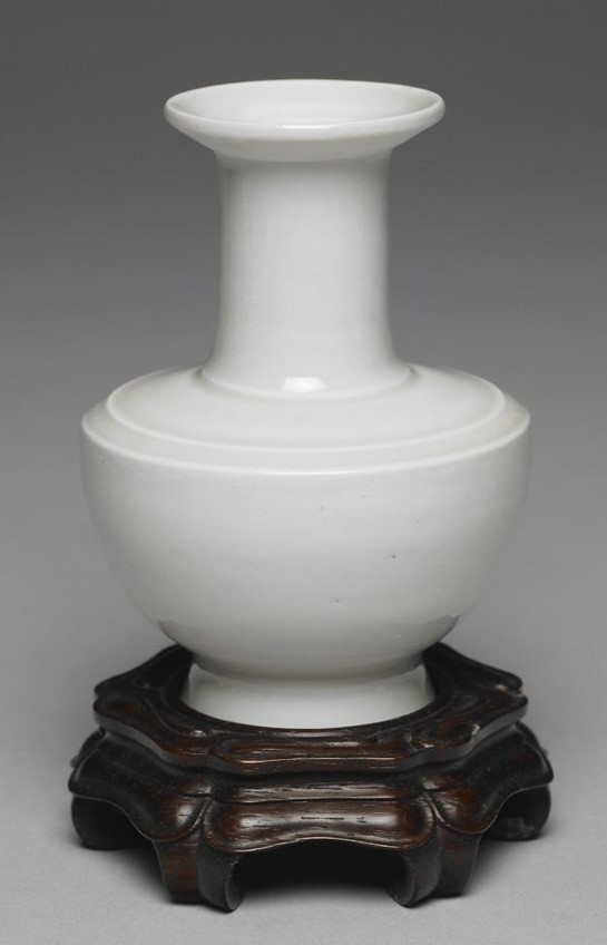 此器呈侈口出唇,長頸,平肩,腹部扁圓,高圈足,肩上一周凸起。胎骨較薄,白釉微現灰青。底刻〈詠定窯小瓶〉御製詩。詩末署「乾隆辛丑春御題」紀年銘(乾隆四十六年,1781),並落「太」和「璞」兩枚鈐印。現今所知傳世帶有御製詩的瓷器,約為130件,可知數量特別稀少。另外,透過御製詩的內容以及器上鈐印,可推知乾隆皇帝對此器的識別與鑑賞觀,益顯珍貴。