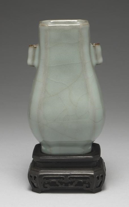 此器呈八方形,長頸,兩側面各飾一貫耳,碩腹,平底,矮圈足。通施粉青色釉,釉薄處現出褐色邊,施釉至足邊,底面有釉,足緣無釉加塗黑灰色護胎汁。底面鐫刻乾隆皇帝〈詠官窯小瓶〉御製詩。詩末無紀年銘,僅署「乾隆御題」,並落「古香」、「太璞」兩枚鈐印。