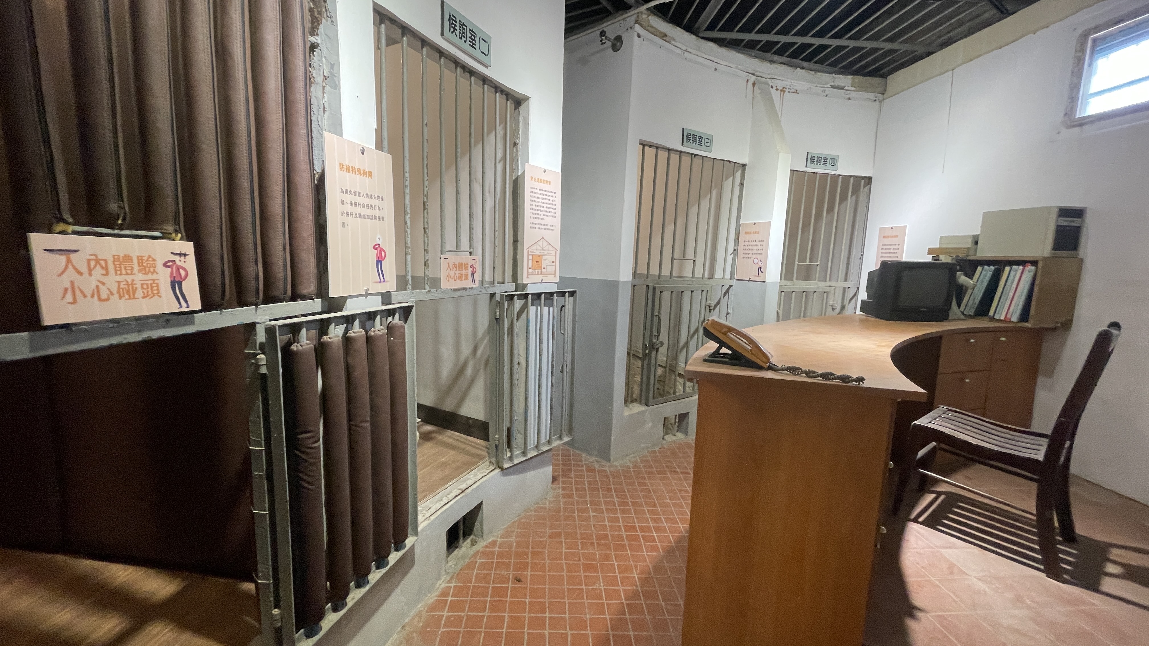 大溪郡役所舊構: 原留置場空間內部則保有抬高木地板構造,地板下則附設通氣孔設備。現況窗扇均為左右推拉窗,氣窗為木作單扇迴轉窗未見文獻記載的上下推拉窗。現存實木窗窗框工法細緻,上部氣窗外部有木作窗簾盒,研判為日治後期或戰後初期的作品。窗框外目前均設有鐵窗,是至今常見的不銹鋼鐵窗。鑑識科(拘留所鄰房)的通氣孔設備,為配合室內抬高木地板所作的設計,具有通風防潮的功用,通氣孔設備外設有鐵欄杆,具有防侵入或逃脫的功能,欄杆內原有木作擋板,具有防止鼠類、蟲蛇類入侵的功能。 留置場: 四間拘留室地坪都是以木構造架高方式呈現,外側有通氣孔,其他通道地坪為磁磚地坪。