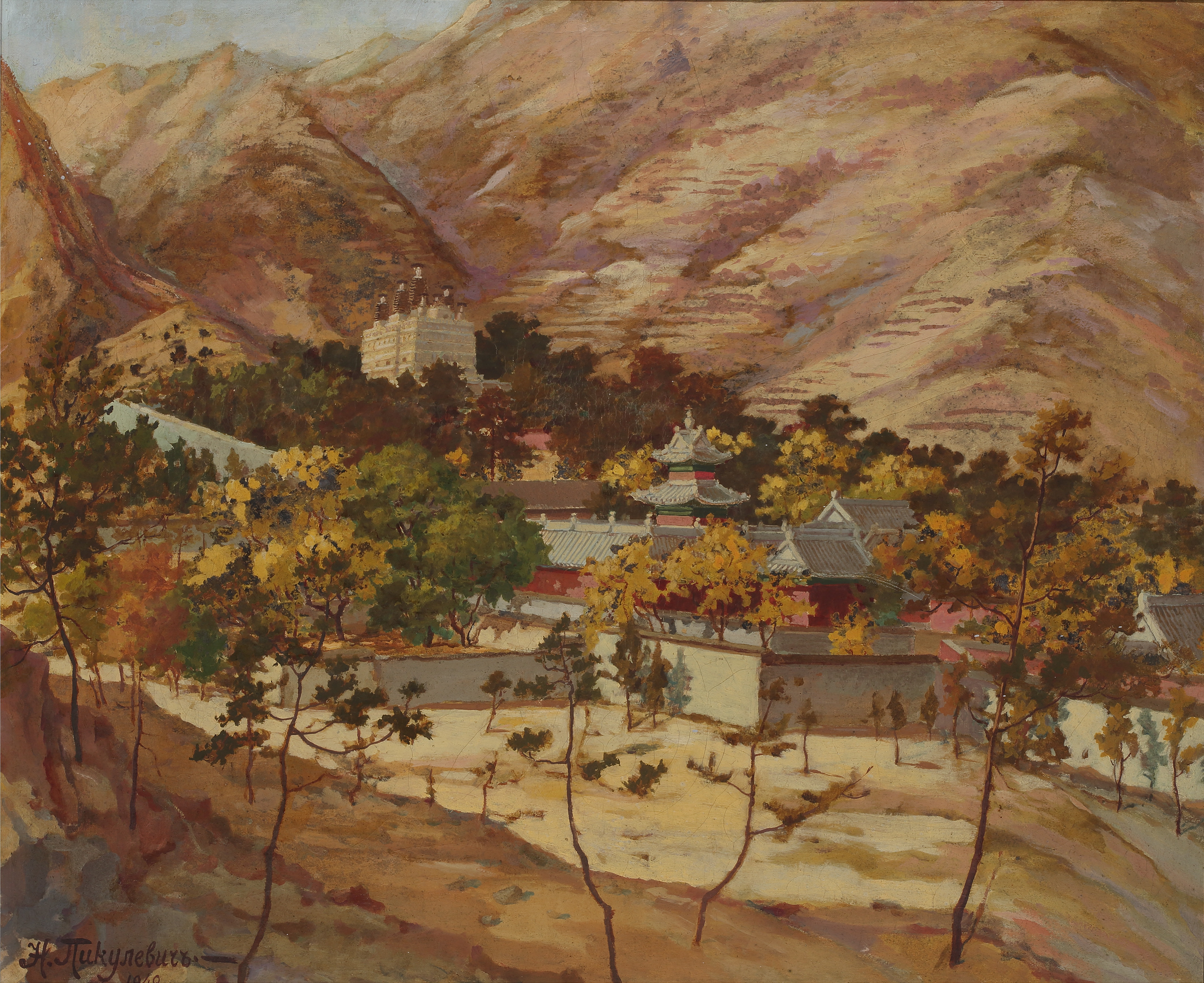 此作品為俄羅斯畫家N.pickulevitch所繪北京香山碧雲寺之景。此幅作品以暖色調為主,除寫實之外,更顯得秋意盎然。畫面左下角的文字,應為作者的俄文署名(H.Пикулевич)與創作年代(1942)。