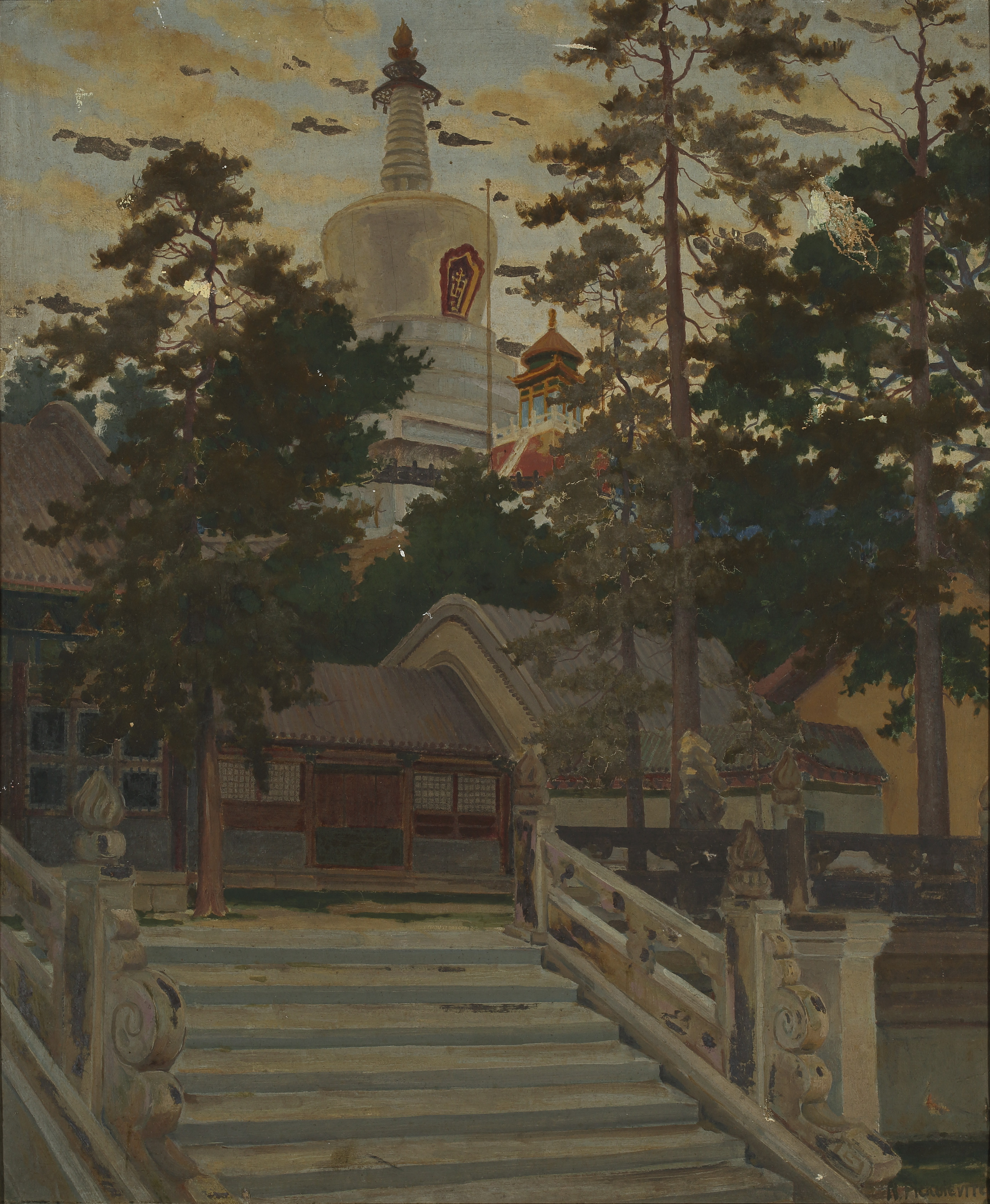 此作品為俄羅斯畫家N.pickulevitch所繪北海公園永安寺白塔之景。此幅作品由畫面下方台階延伸向上,畫面中心為永安寺,畫面上方為白塔,畫面層次分明,且突顯了白塔高聳之勢。畫面右下角的文字,為作者的英文署名(N.pickulevitch)。