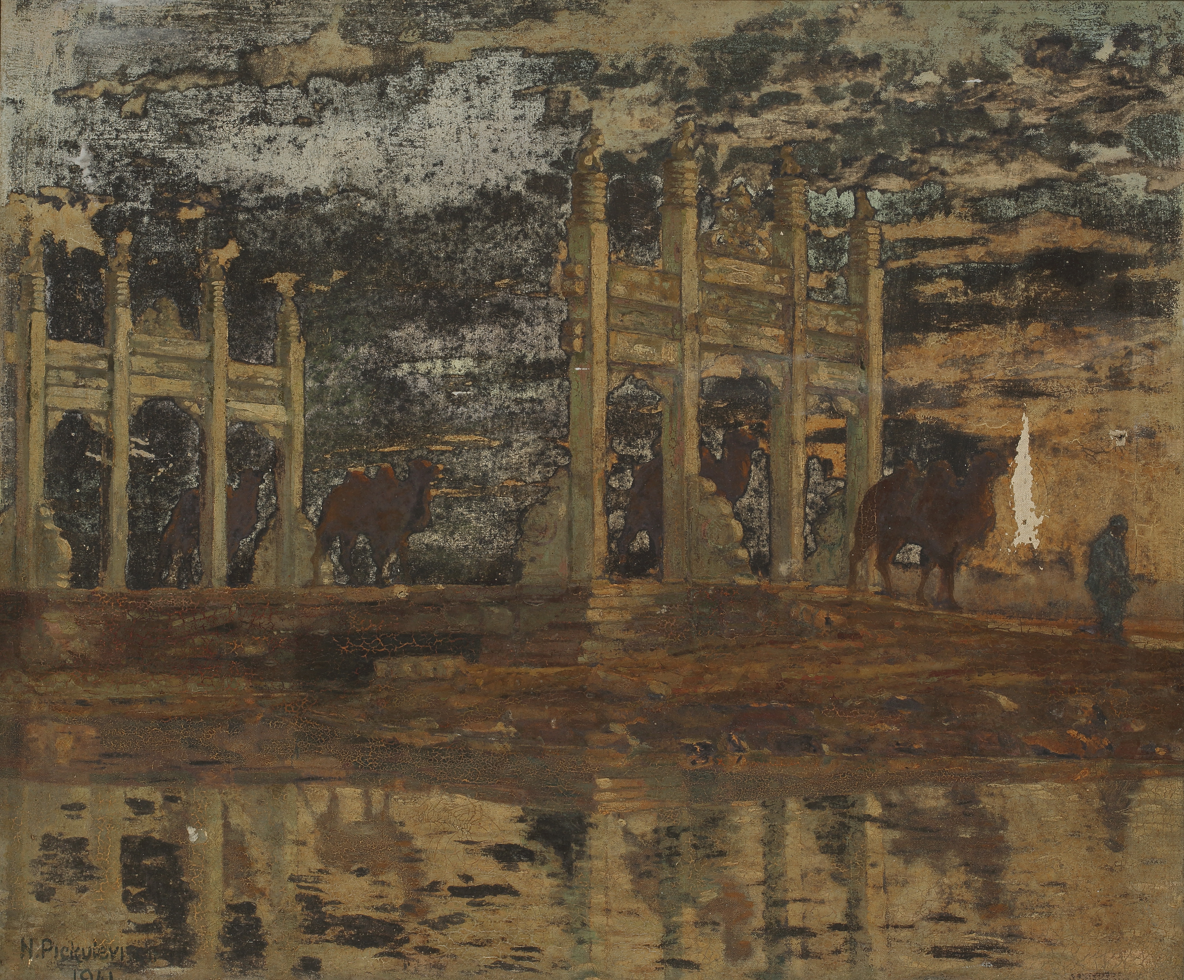 此作品為俄羅斯畫家N.pickulevitch所繪北平西便門外官道之景。此幅作品中央為一列隊伍穿過石牌坊之下,隊伍前方由一人行走領隊,後方有四隻駱駝跟隨其後,整體色調偏暗,而石牌坊則相對明亮,顯示畫作之主體。畫面左下角的文字,應為作者的英文署名(N.pickulevitch)與創作年代(1941)。
