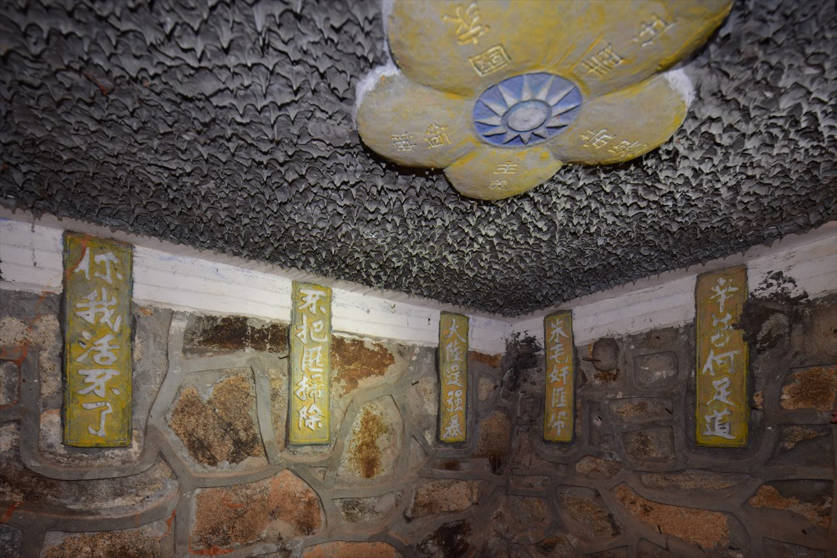 1. 入口處塊石縫隙砂漿流失,地面土石堆積。 2. 內部構造現況尚可,重要價值之泥塑標語狀況佳。