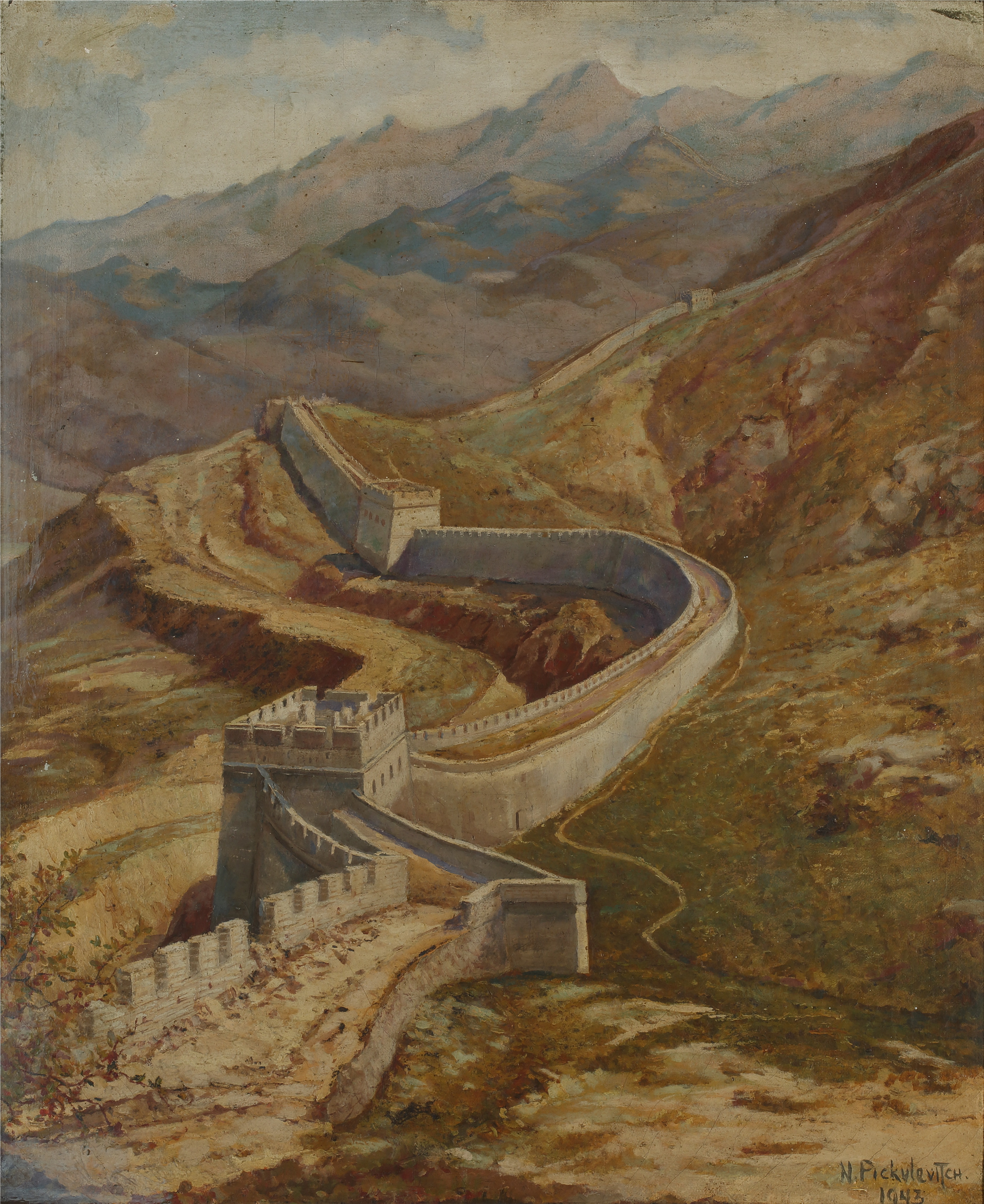 此作品為俄羅斯畫家N.pickulevitch所繪萬里長城之景。此幅作品中的長城由畫面左下方為起始,綿延至畫面右上方,而作為背景的山巒則使用藍色調,呈現其深遠之意象,更顯長城之遼闊無邊。畫面右下角的文字,應為作者的英文署名(N.pickulevitch)與創作年代(1943)。